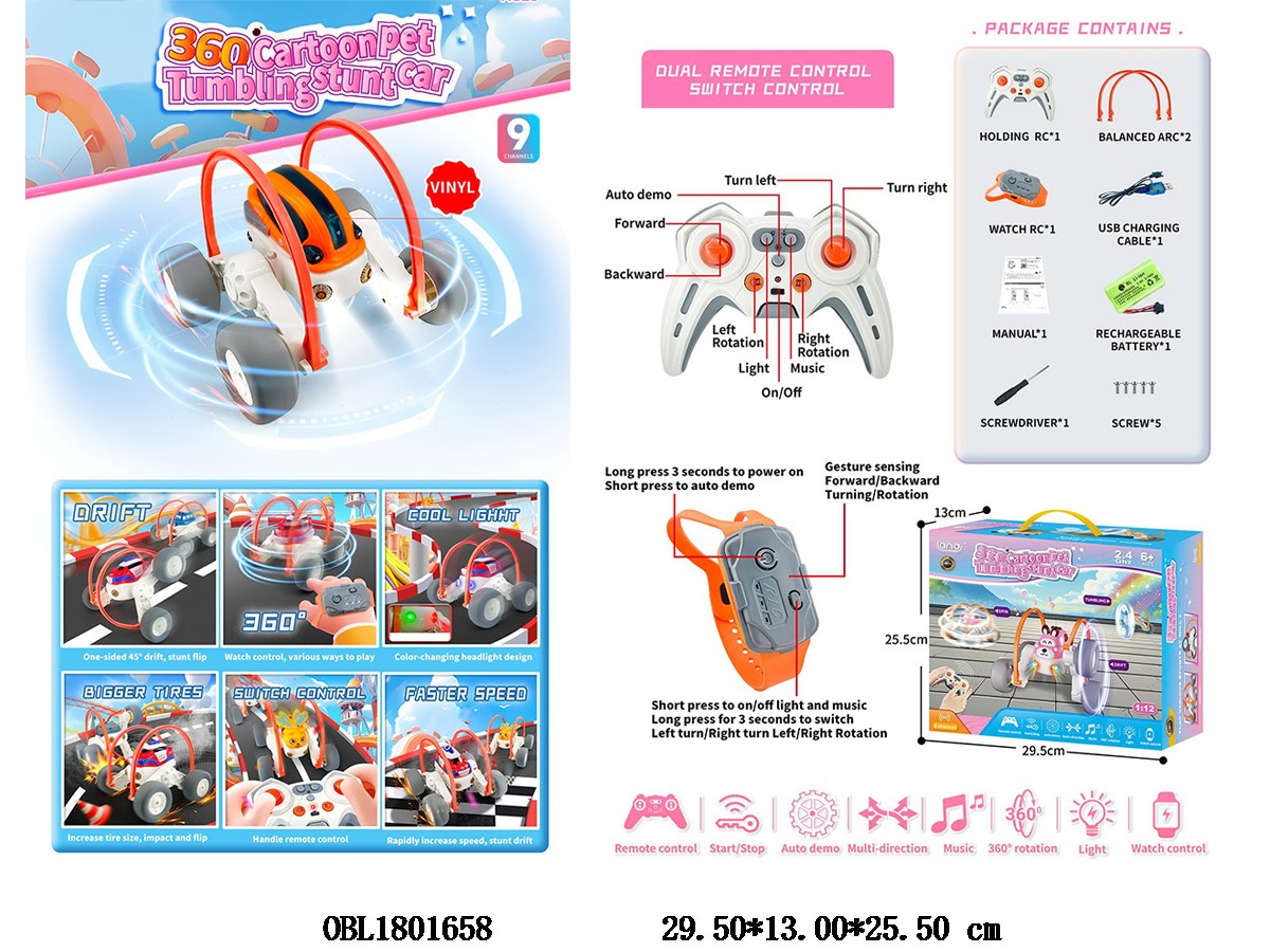 双遥控九通遥控搪胶卡通特技车带灯光 配USB线 车身7.4V锂电池包电 遥控器2*AA无包电 手表遥控器2*AAA不包电 2.4G频率