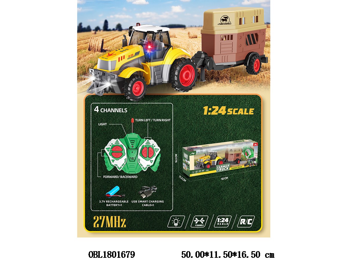 首页 > 遥控车 > 1:24四通遥控农夫车拖畜牧房车带灯光 配USB线 车身3.7V锂电池包电 遥控器2*AA无包电 27频率