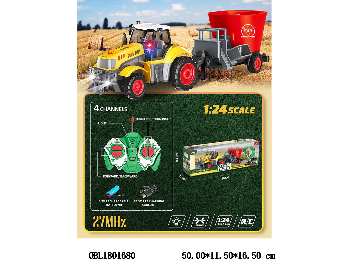 1:24四通遥控农夫车拖稻谷搅拌车带灯光 配USB线 车身3.7V锂电池包电 遥控器2*AA无包电 27频率