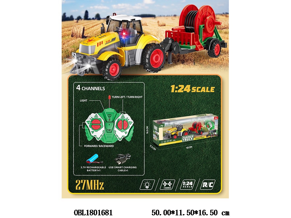1:24四通遥控农夫车拖抽水车带灯光 配USB线 车身3.7V锂电池包电 遥控器2*AA无包电 27频率