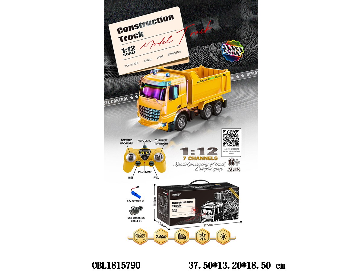 欧式1:12七通遥控自卸工程车带灯光 配USB线 车身3.7V锂电池包电 遥控器2*AA无包电 2.4G频率