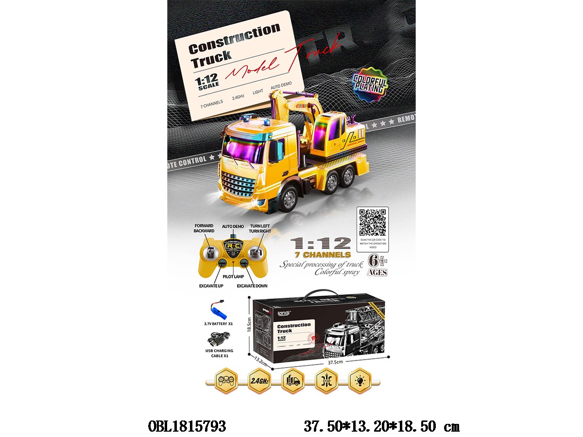欧式1:12七通遥控挖掘工程车带灯光 配USB线 车身3.7V锂电池包电 遥控器2*AA无包电 2.4G频率