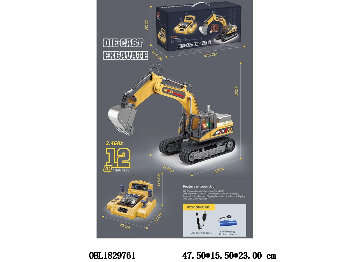 12通方向盘遥控合金挖掘机带灯光音乐 配USB线 车身3.7v包电 遥控2*AA不包电 2.4G