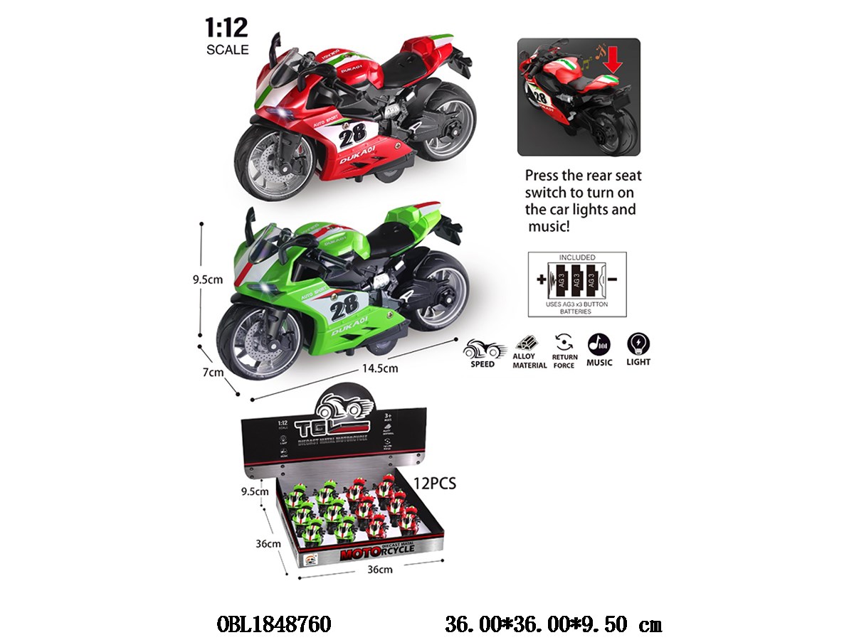 1:12合金回力摩托车带灯光音乐 2色混装 3*AG3包电 12只装1展示盒