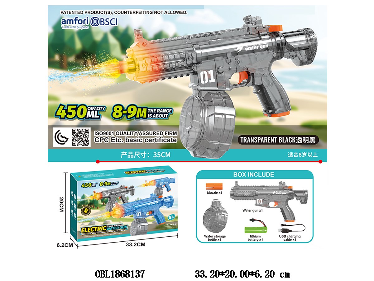 透明黑电动水枪带灯光 350ml 配USB线 3.7V电池包电