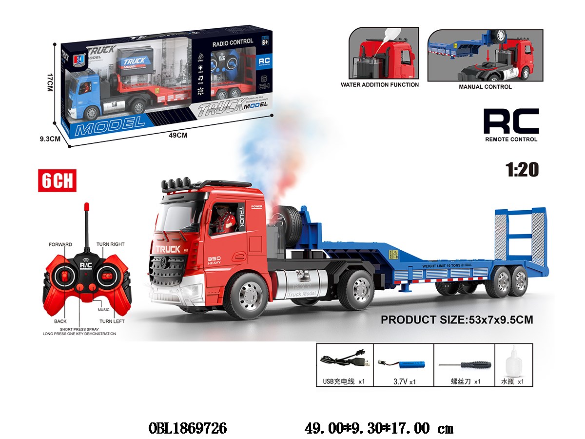 首页 > 遥控车 > 六通遥控平板卡车带灯光声音冒烟 配USB线 车身3.7V锂电池包电 遥控器2*AA不包电 49频率 2色混装