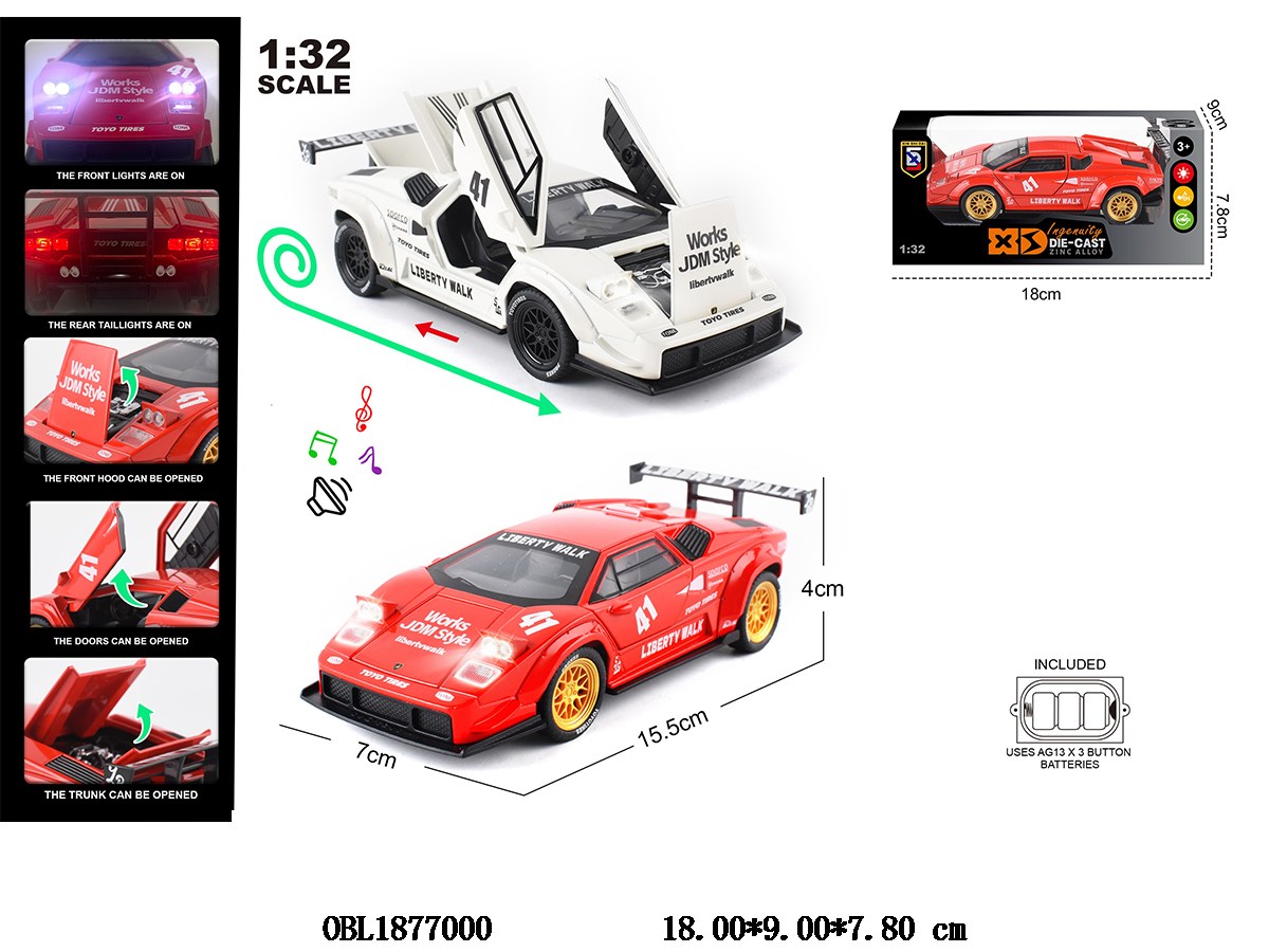 首页 > 合金车 > 1:32 铸锌合金回力车 带灯光音乐 可开门 3*AG13包电 2色混装