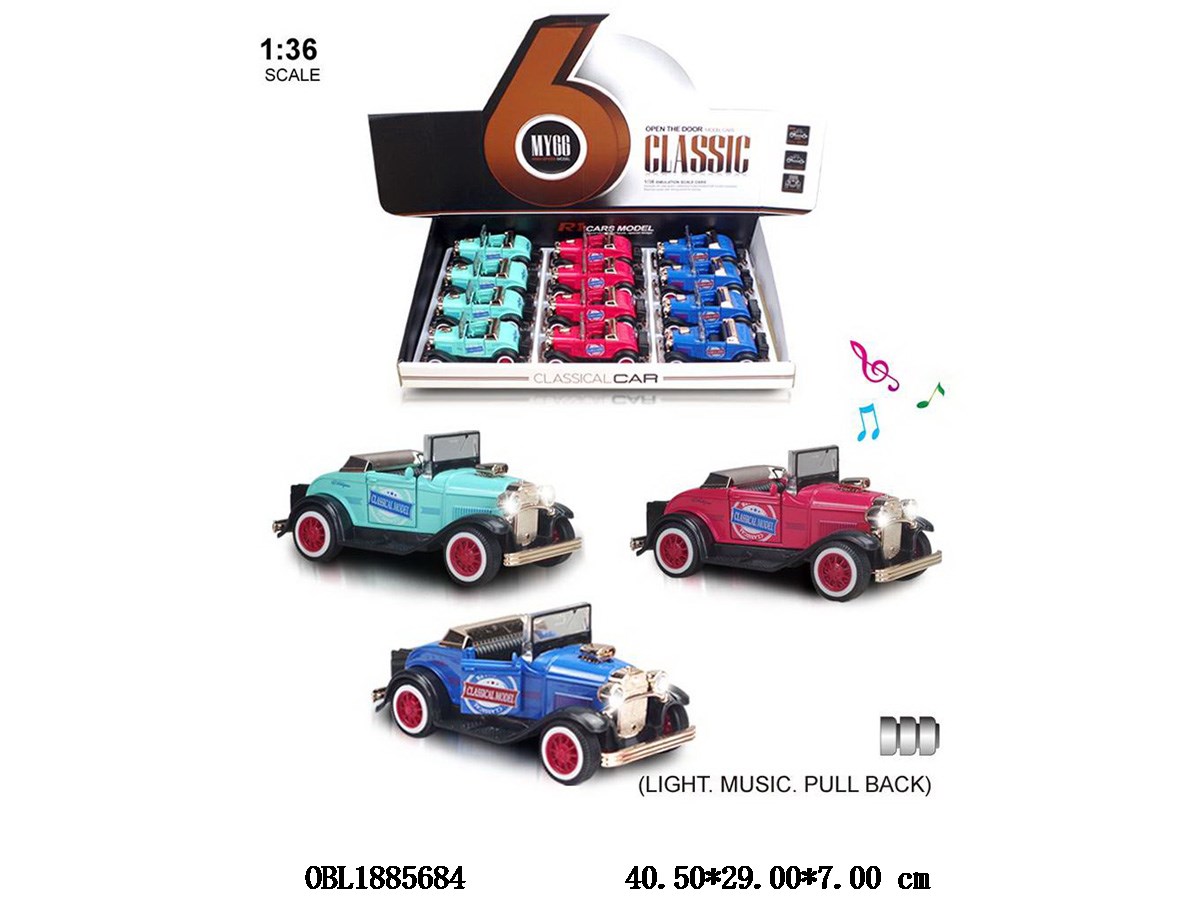 1:36合金回力车带灯光声音 可开门 3*AG3包电 3色混装 12只装一展示盒