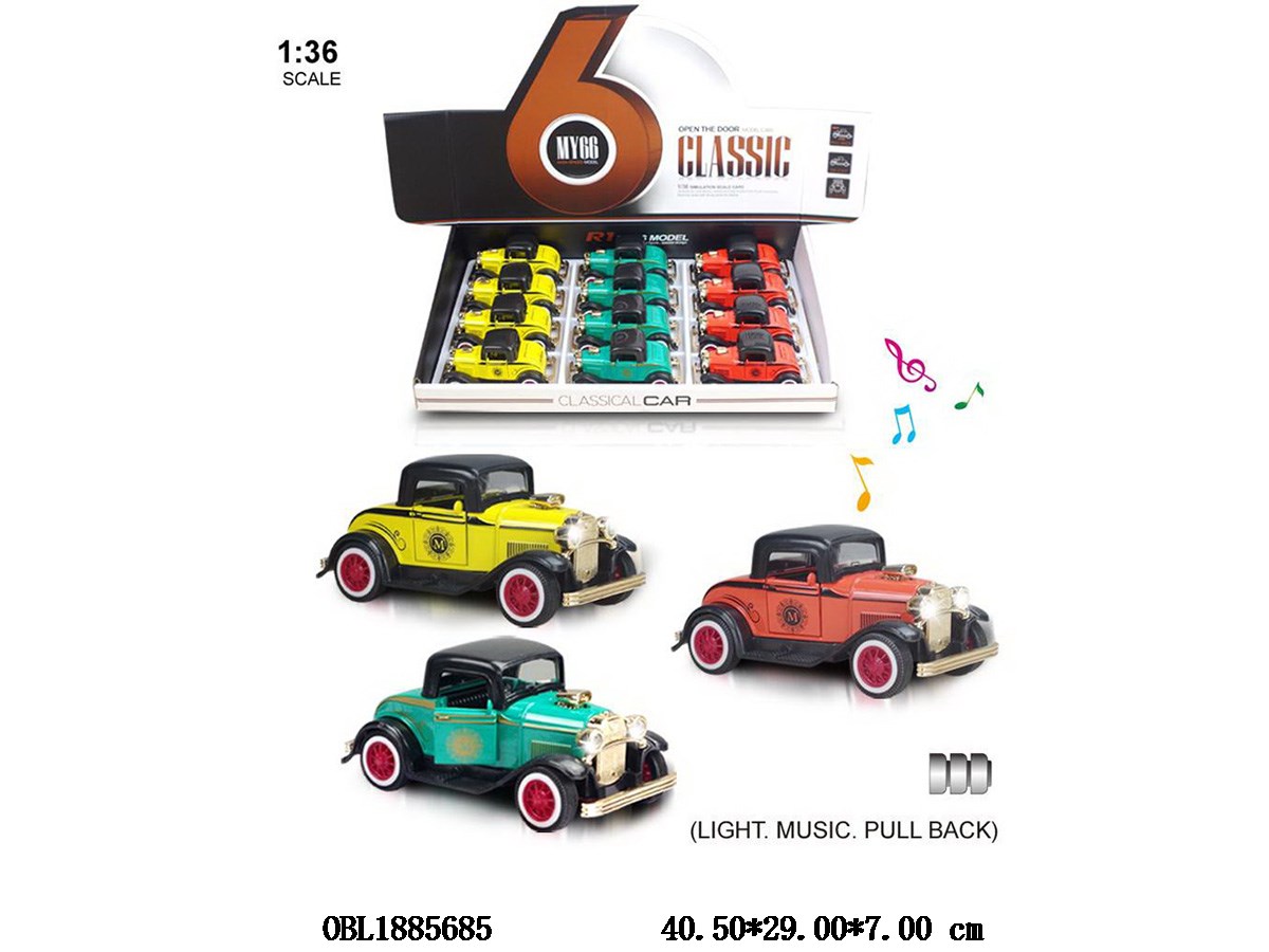 1:36合金回力车带灯光声音 可开门 3*AG3包电 3色混装 12只装一展示盒
