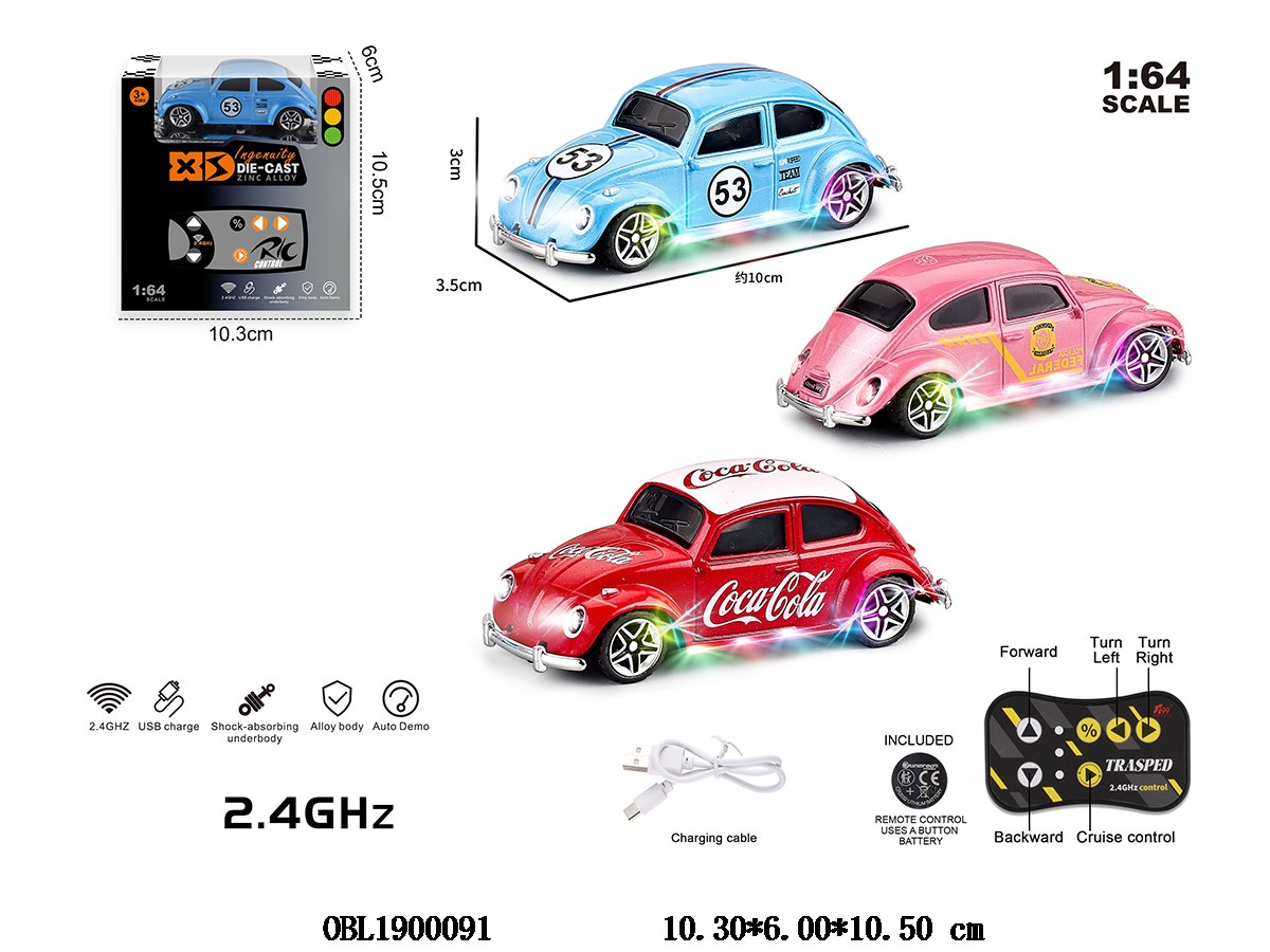 1:64 合金遥控车 带灯光 配USB线 3.7v锂电池包电 遥控1*CR2032包电 手机APP遥控 2.4G频率 3色混装