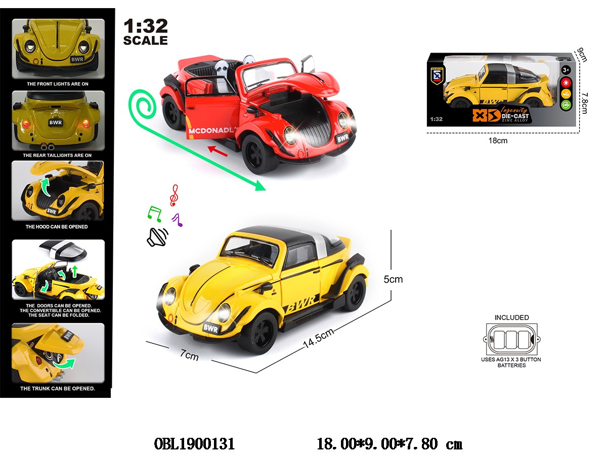 1:32 压铸锌合金回力车 带灯光音效 可开门 3*AG13包电 2色混装