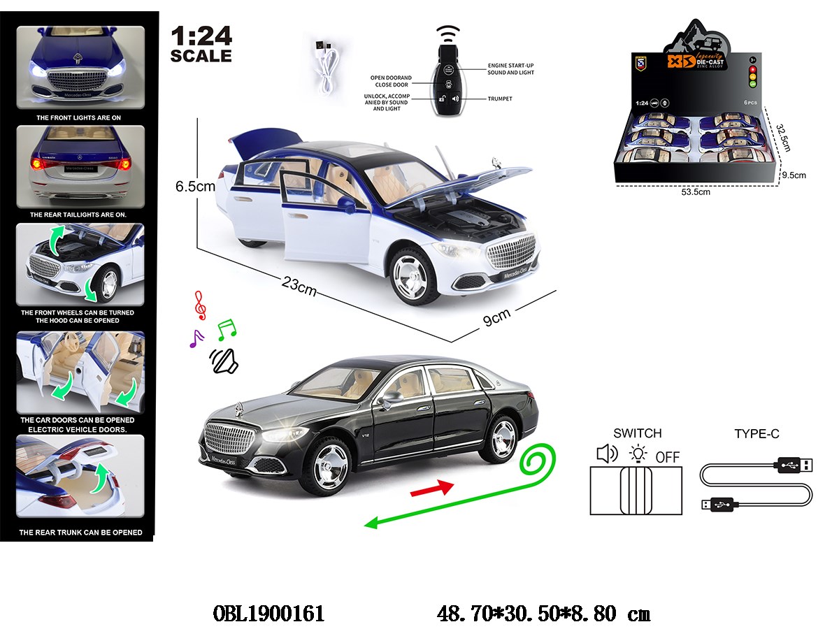 首页 > 合金车 > 1:24 压铸锌合金回力车 带灯光音效 电动开门 3*AG13包电 2色混装 6只装一展示盒