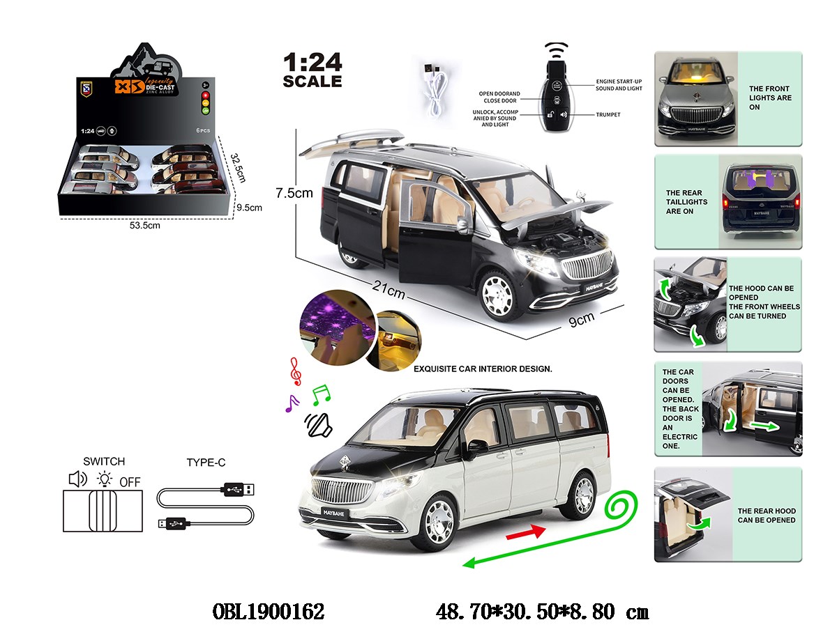 首页 > 合金车 > 1:24 压铸锌合金回力车 带灯光音效 电动开门 3*AG13包电 2色混装 6只装一展示盒