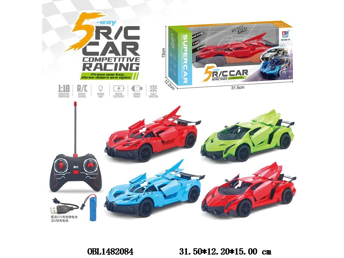 1:16 five-way remote control car with light, one button and three doors, with USB data cable, body 3.7V lithium battery power pack remote control, 2 * AA power pack, 2 models, 4 colors, 27 frequencies