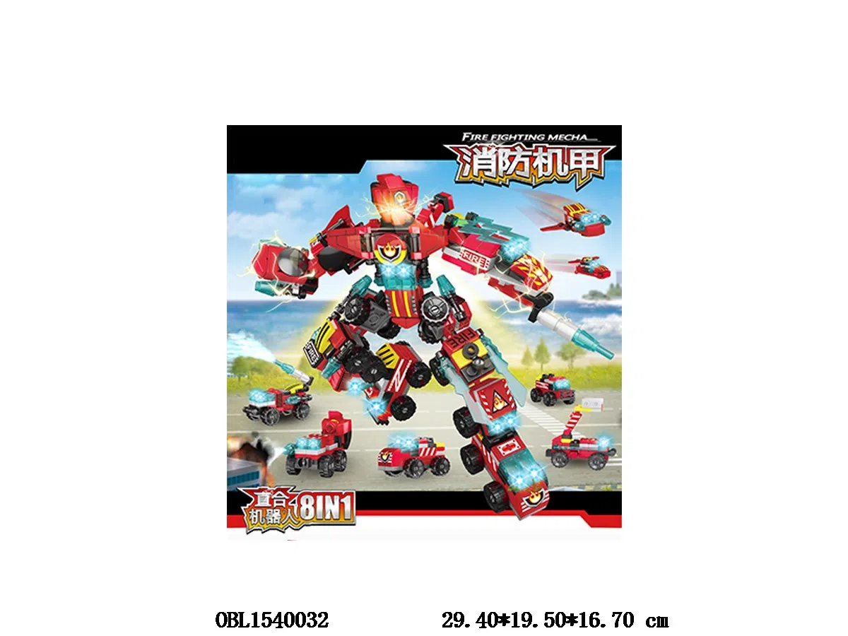 Chinese version of puzzle building blocks 8-in-1 fire mecha, 16 small boxes, 1 display box, 8 mixed packages