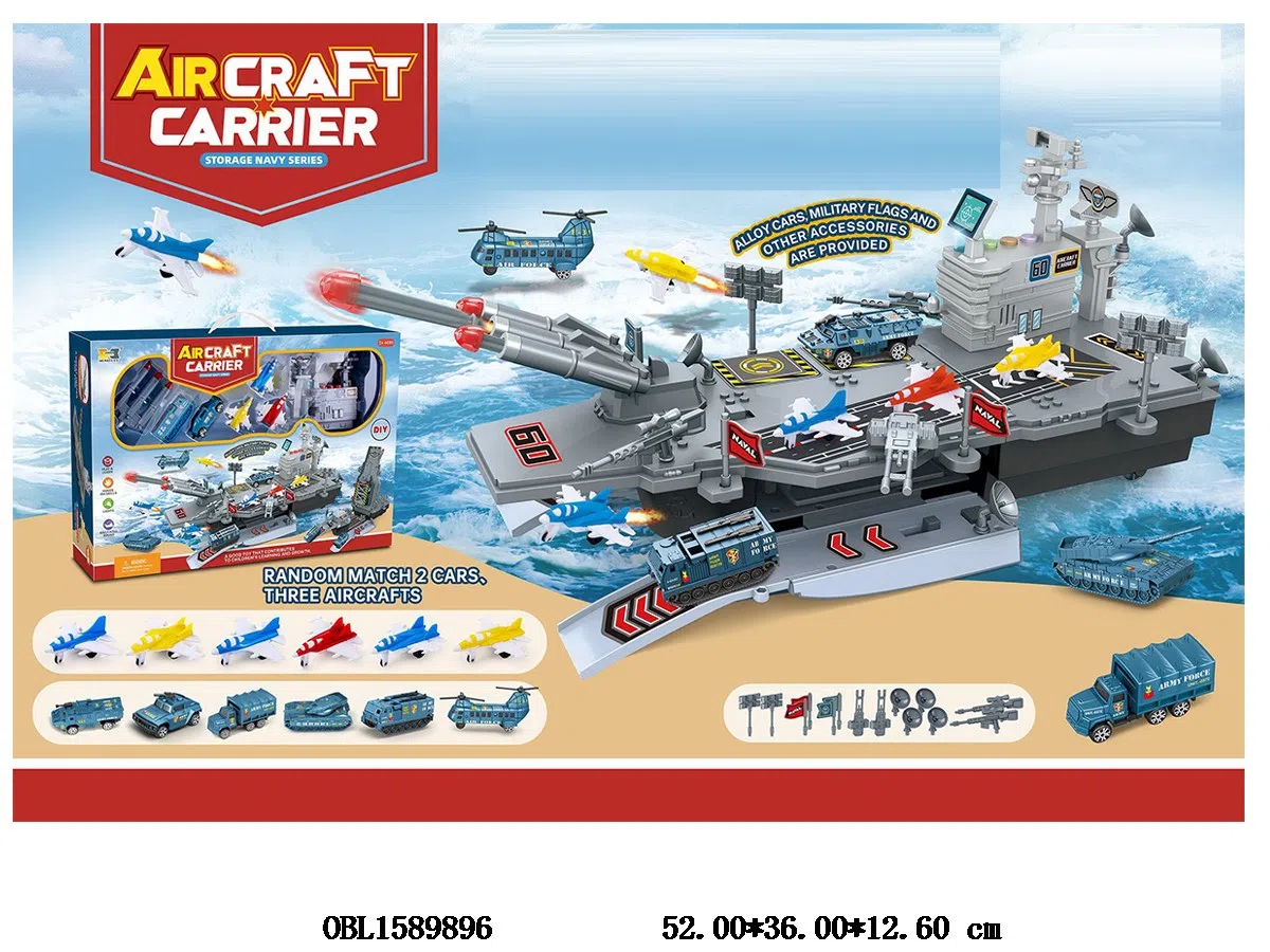 Two in one storage and deformation sliding aircraft carrier set with lighting, sound, and launching missiles, equipped with 2 alloy cars, 3 non functional aircraft, 2 * AA, no battery pack