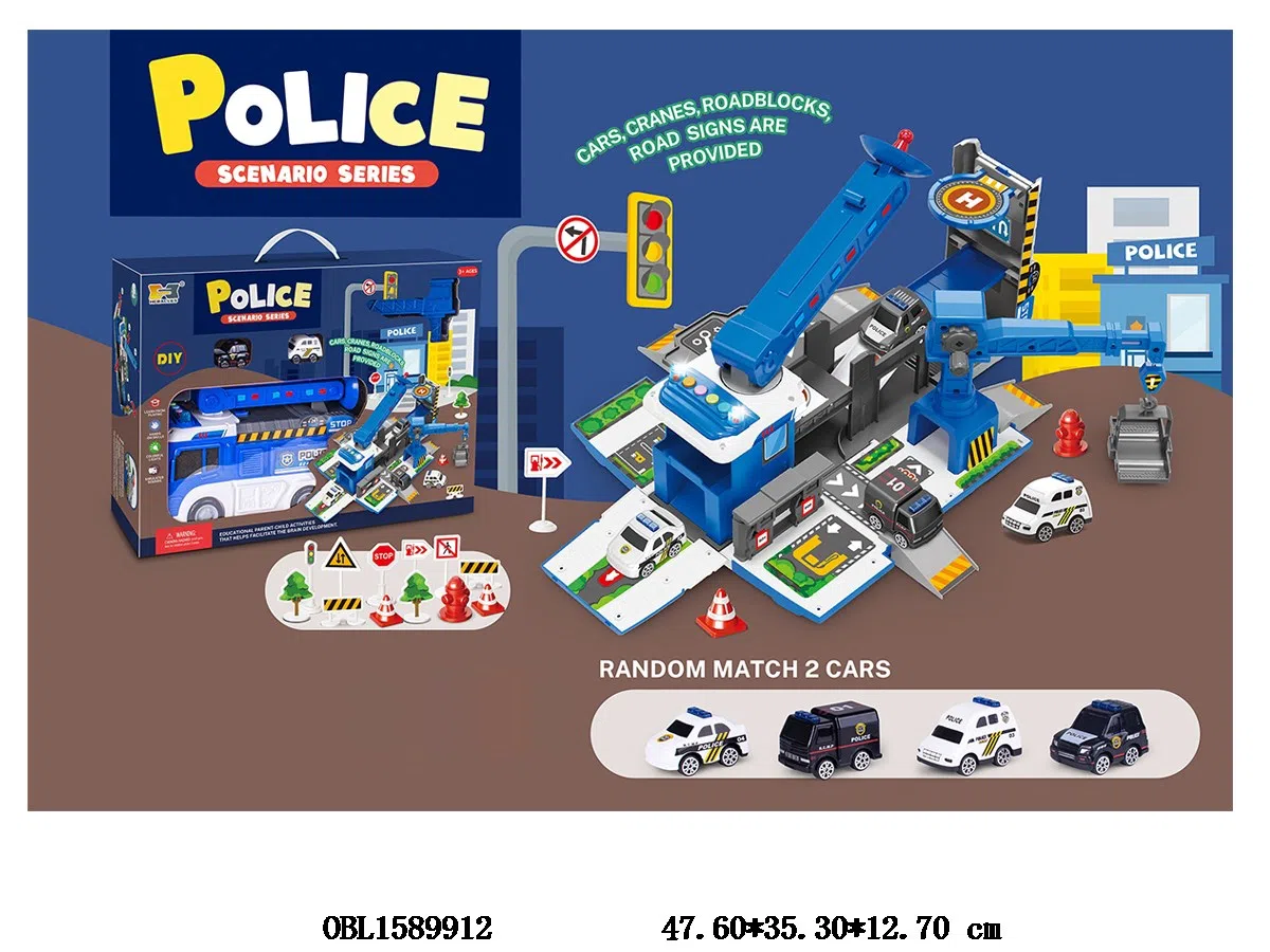 Two in one storage deformation sliding police car parking lot set with lighting and sound, equipped with 2 alloy police cars, 3 * AAA, no battery pack