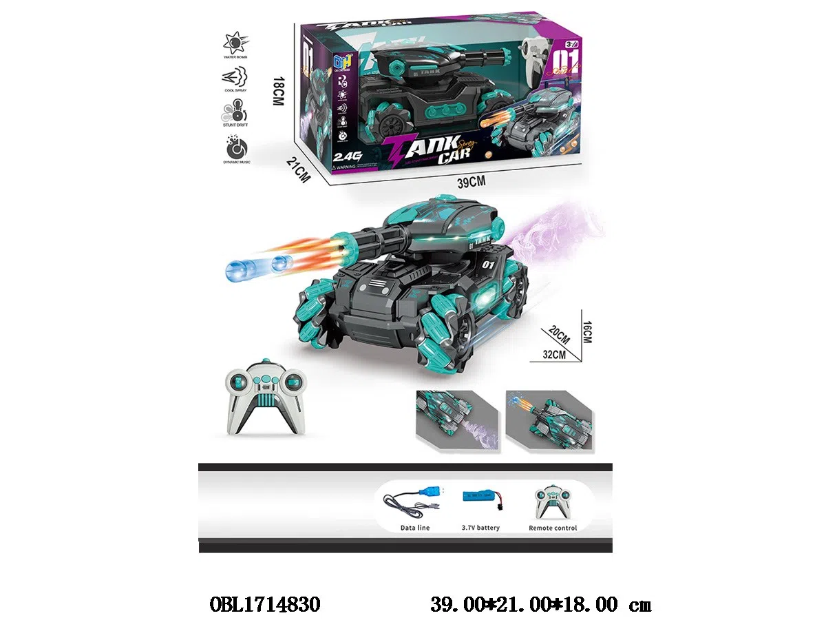 Remote control car with flame light, music, spray, water bomb, USB cable, body, 3.7V lithium battery pack, electric remote control, 2 * AA, no power pack, 2.4G frequency