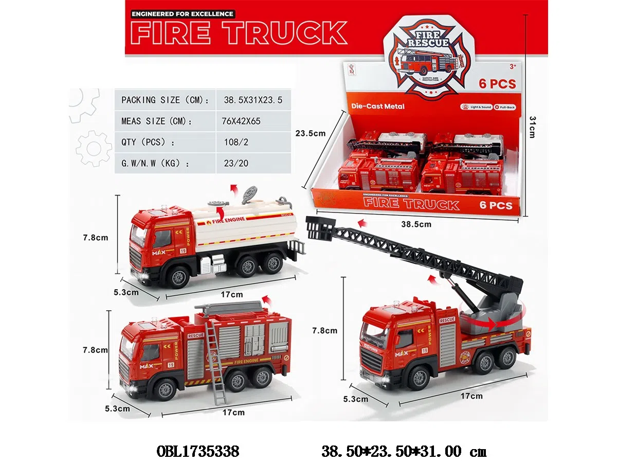 Alloy European style regenerative fire truck with lighting and sound, 3 * AG13, including electricity, 3 mixed models, 6 pieces, 1 display box