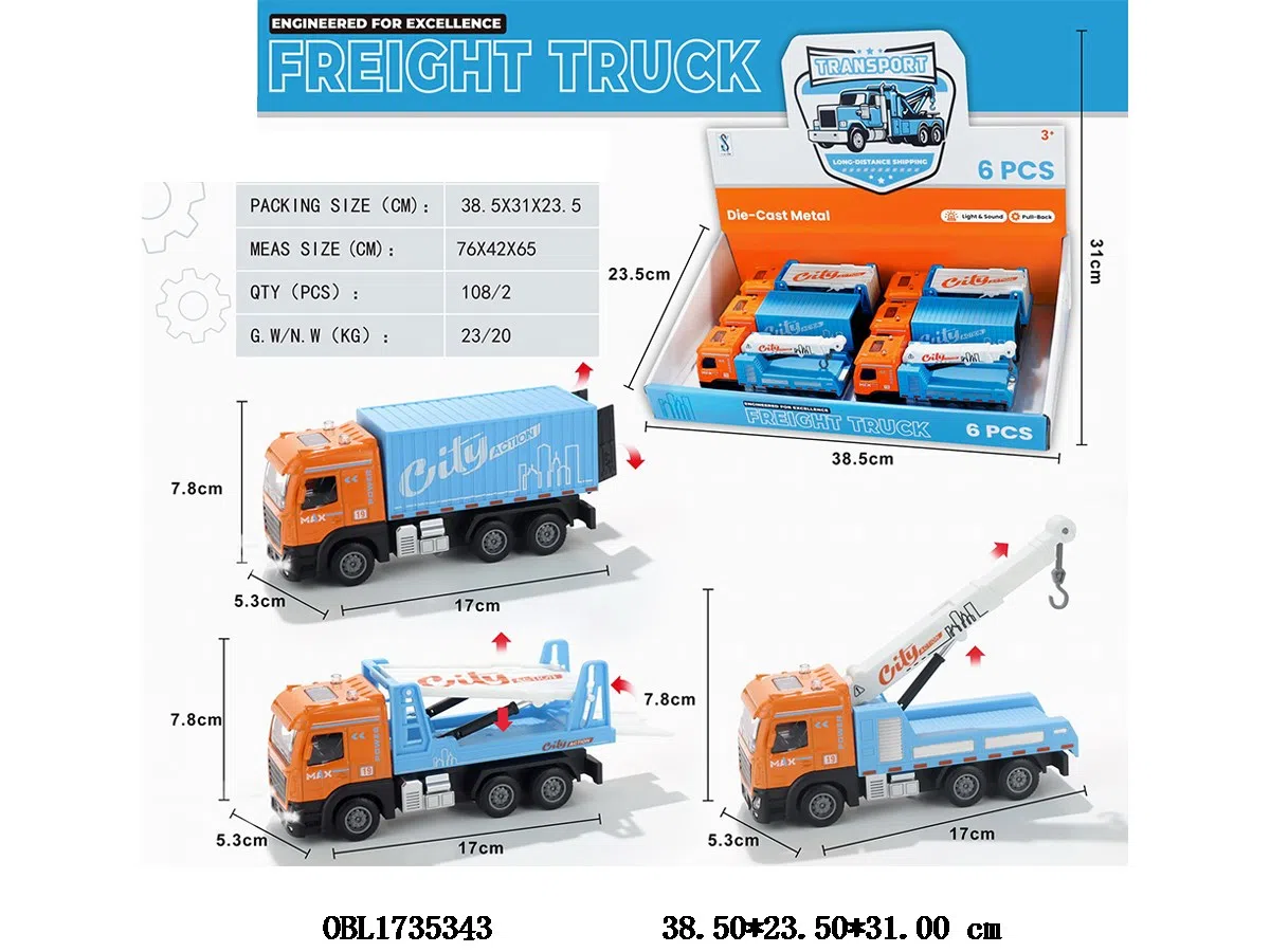 Alloy European style urban transport vehicle with lighting and sound, 3 * AG13, including electricity, 3 mixed models, 6 pieces, 1 display box