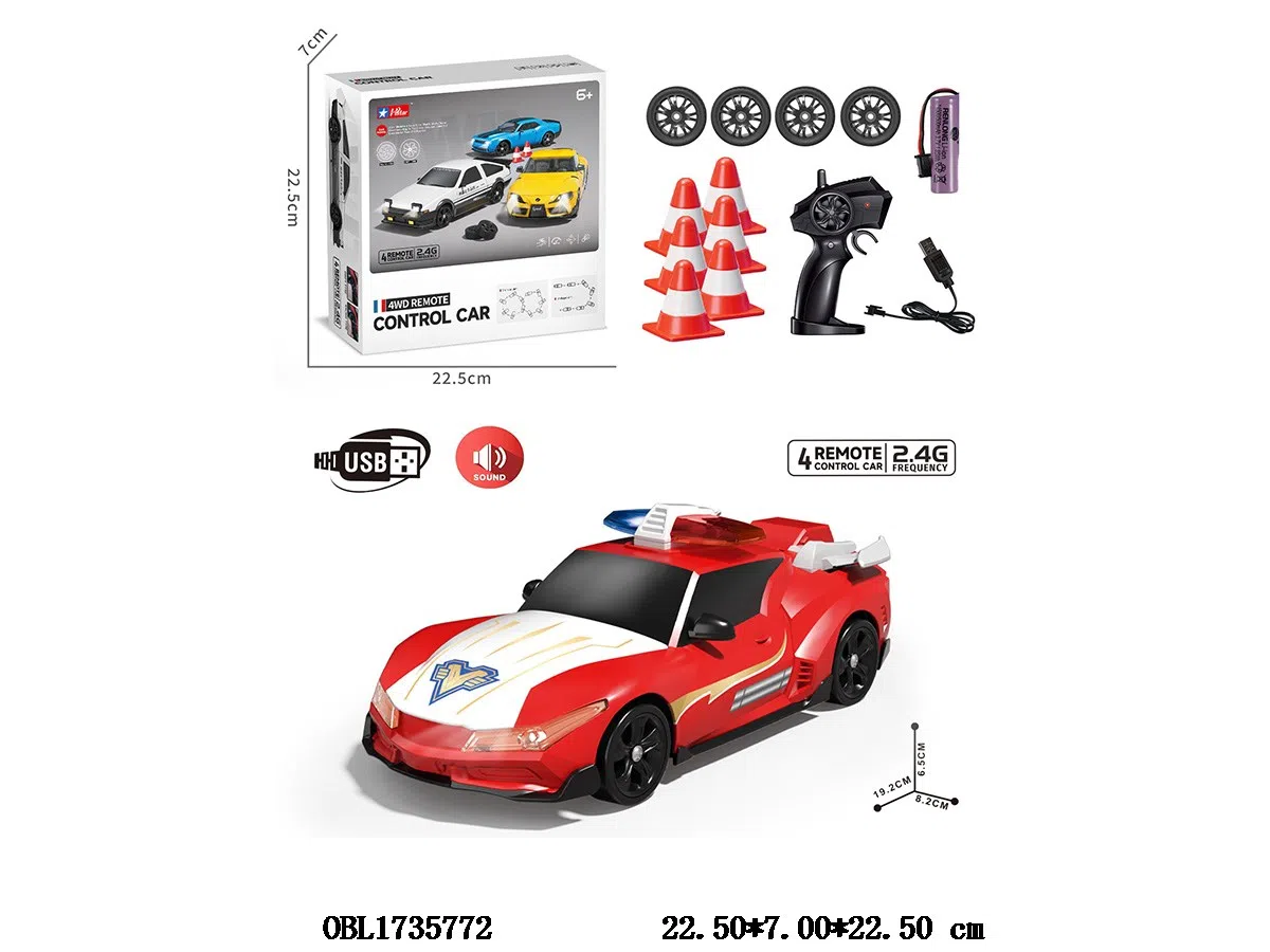 Four way remote control police car set with lights, sound drift, USB cable, body 3.7V lithium battery included remote control 2 * AA without power, 2.4G frequency red