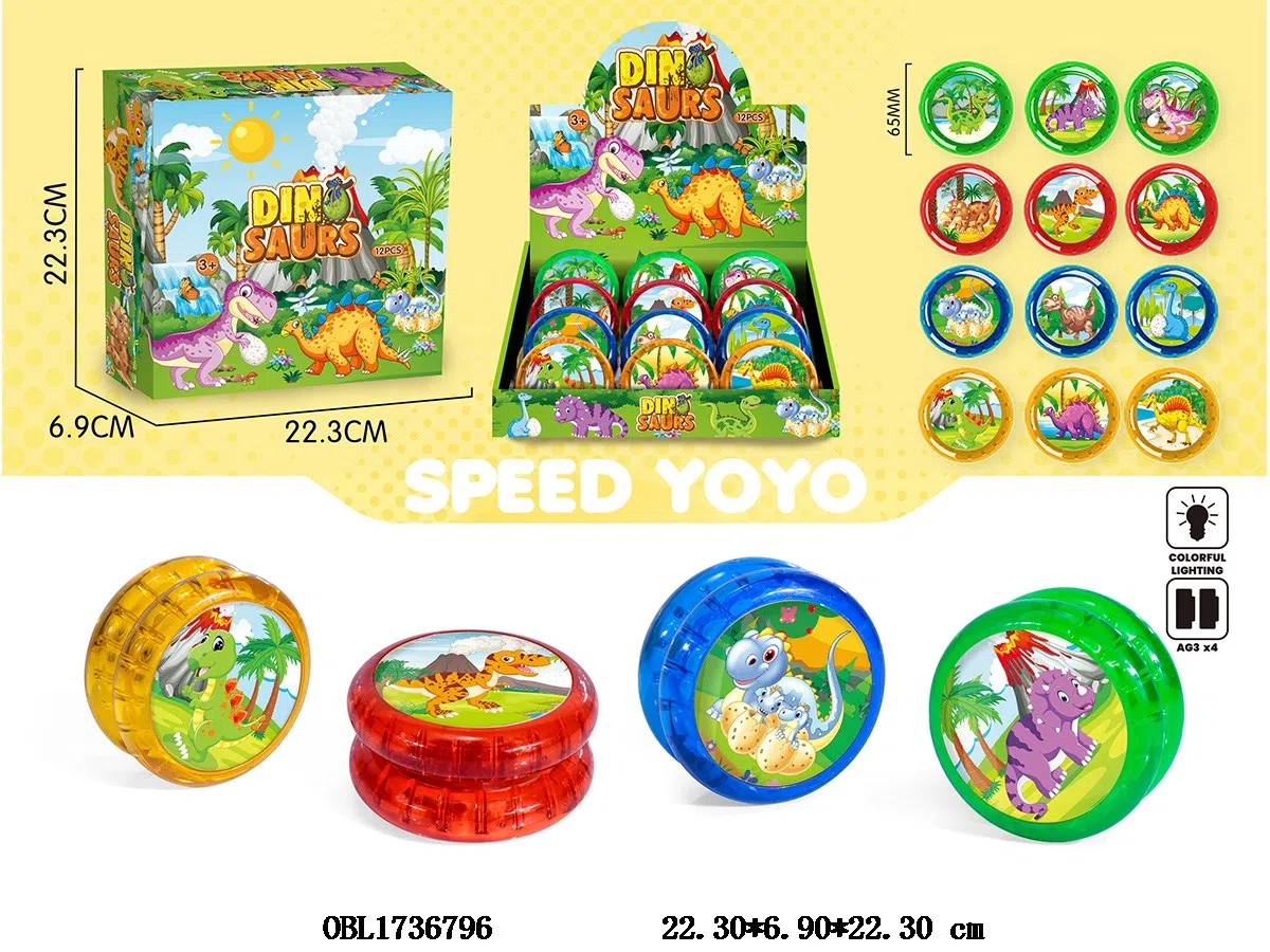 Dinosaur yo yo, double-sided with colorful lights 4 * AG3, packaged with 12 batteries in a display box, 4 colors mixed with random patterns
