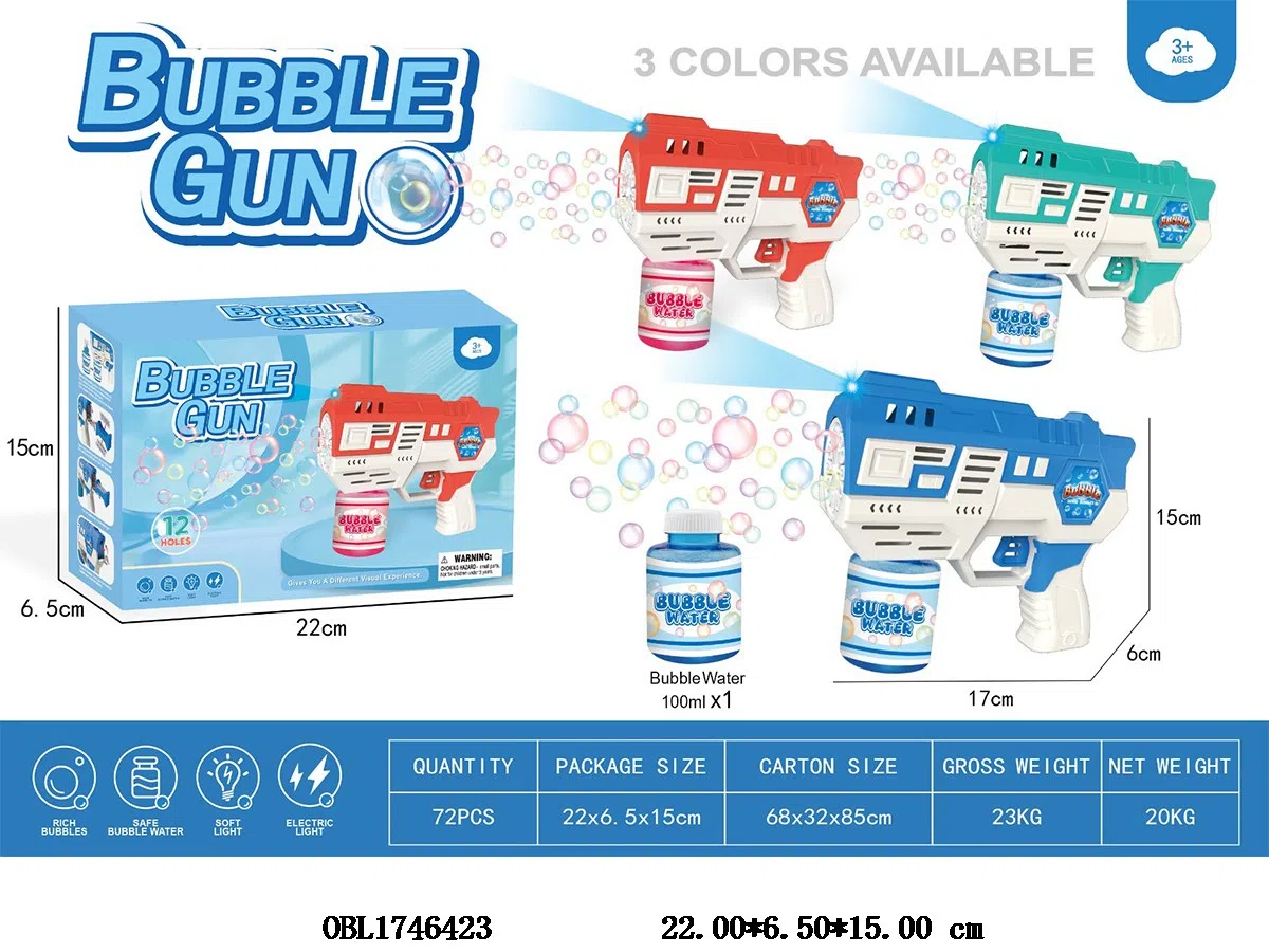 12 hole electric bubble gun with light and 100ml bubble water 4 * AA, non electric, 3-color mixed design