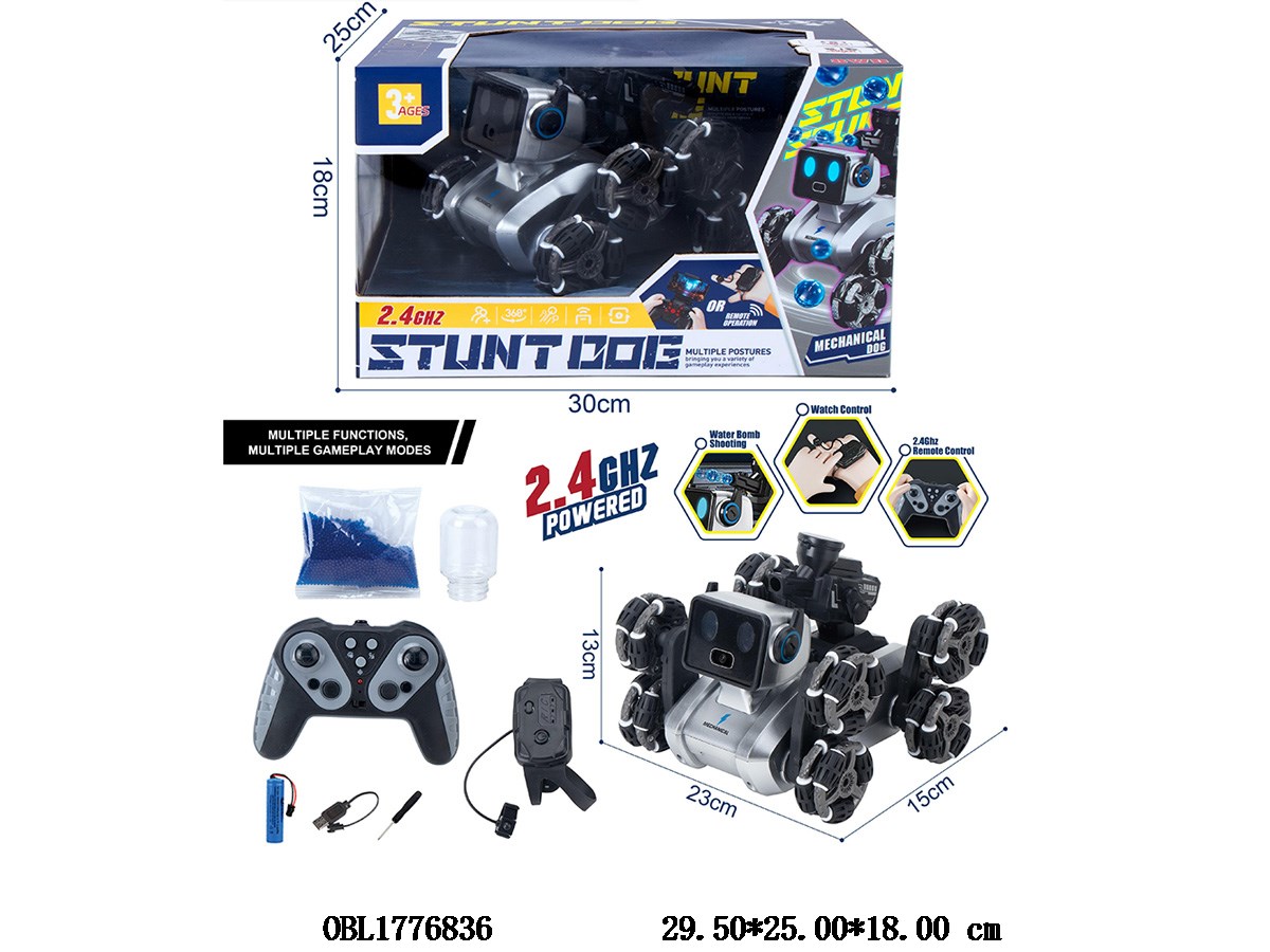 Home > R/C Animals > Dual remote control stunt mechanical dog with lights, sound, water dispenser, USB cable, 3.7V battery pack remote control, 3 * AA non battery pack remote control, watch remote control, non battery pack 2.4G frequency
