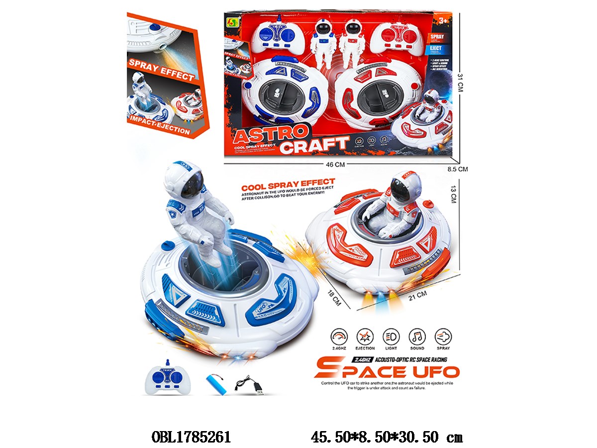 Two four-way remote control spaceman flying saucer vehicles with light, music, spray collision spaceman can be ejected, equipped with USB cable, 3.7V lithium battery pack, electric remote control, 2 * AA, no power pack, 2.4G frequency, 2-color mixed installation