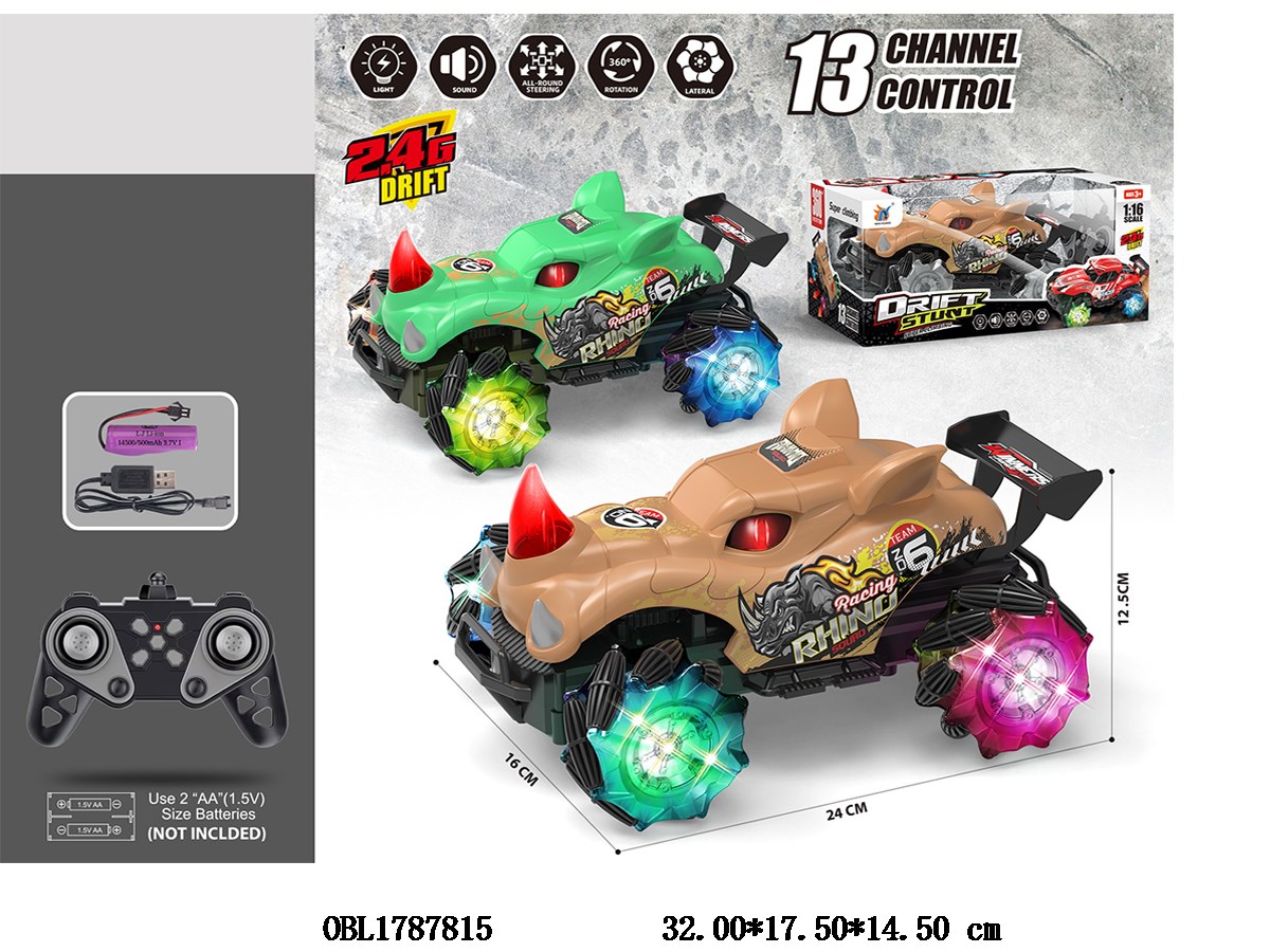 Home > R/C Car > 1: 16 Thirteen Way Side Drift Remote Control Car with Colorful Sound and Light Equipped with USB Cable Body 3.7V Lithium Battery Powered Remote Control 2 * AA Non Powered 2.4G Frequency 2-Color Hybrid