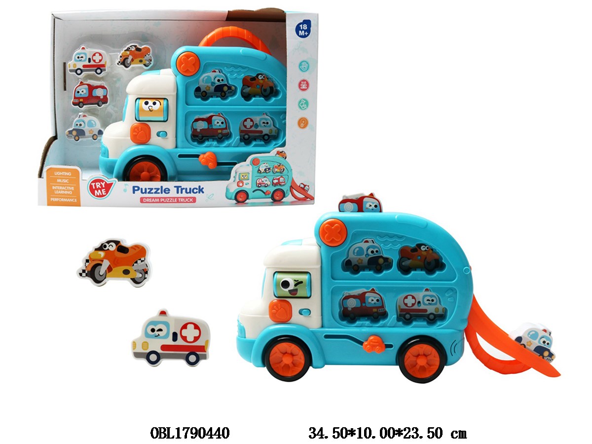 Home > Free Wheel Car > Sliding puzzle truck with lights, music, 2 * AAA power package