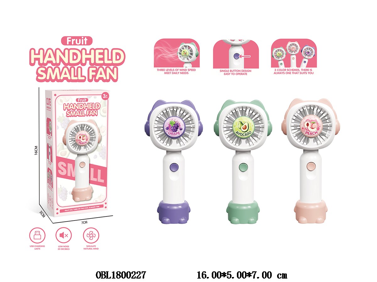 Home > Fan > Charging fruit handheld fan with base and USB cable, lithium battery 500mA, packaged with Type-C plug, 3-color mixed design