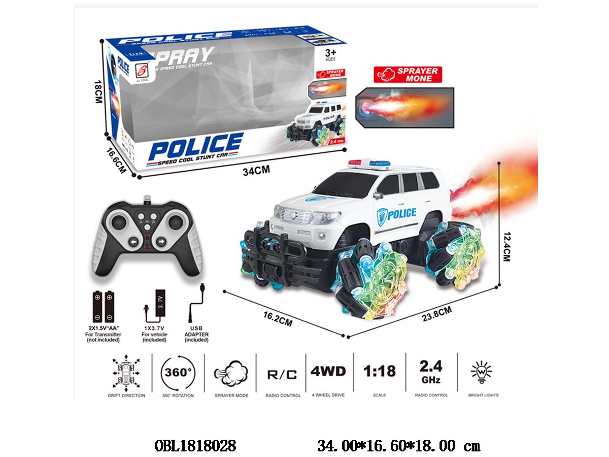 Jiutong remote control police car with lights, spray, USB cable, body 3.7V battery pack, electric remote control, 2 * AA, no power pack, 2.4G frequency, white/black mixed