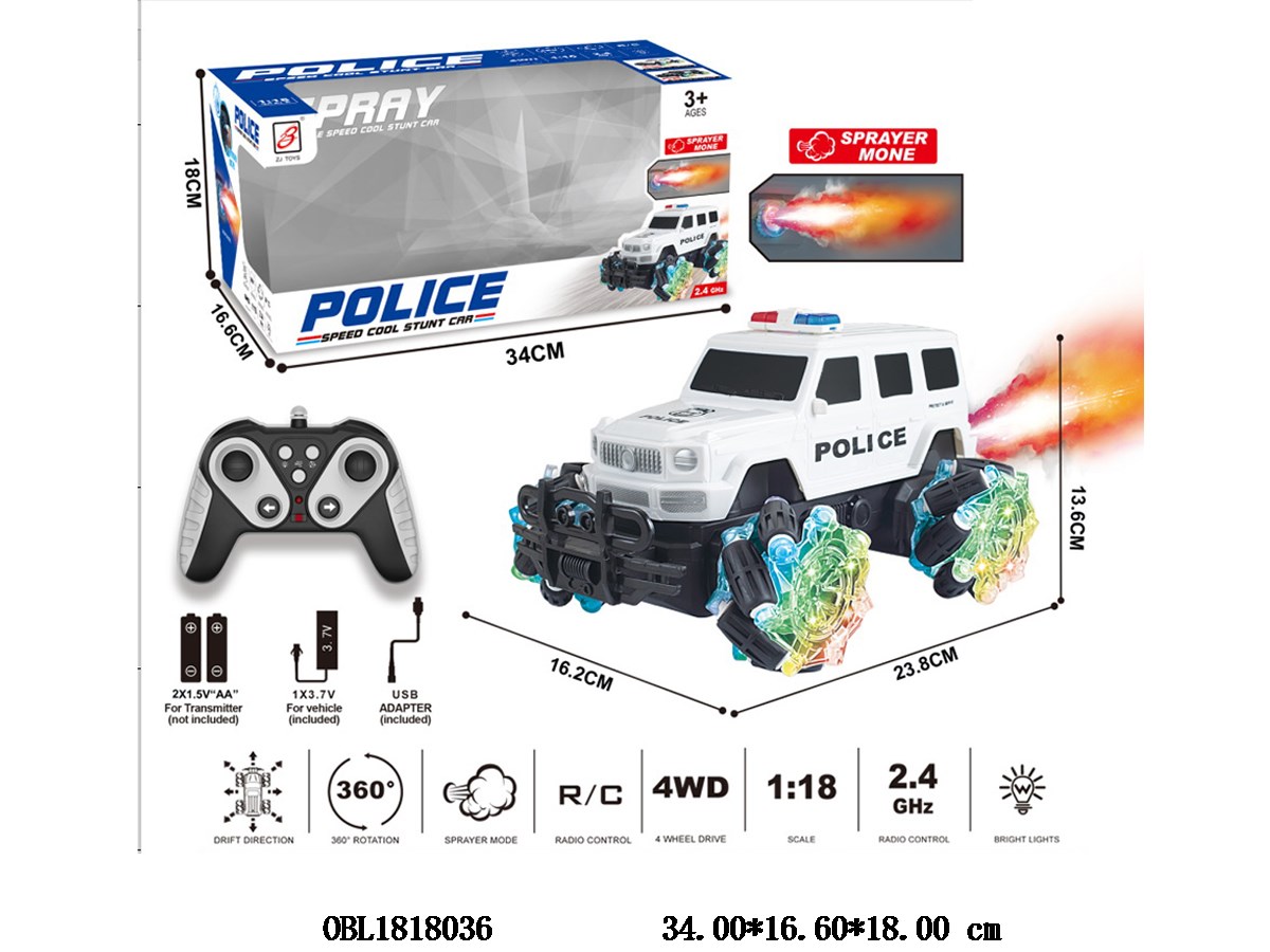 Jiutong remote control police car with lights, spray, USB cable, body 3.7V battery pack, electric remote control, 2 * AA, no power pack, 2.4G frequency, white/black mixed
