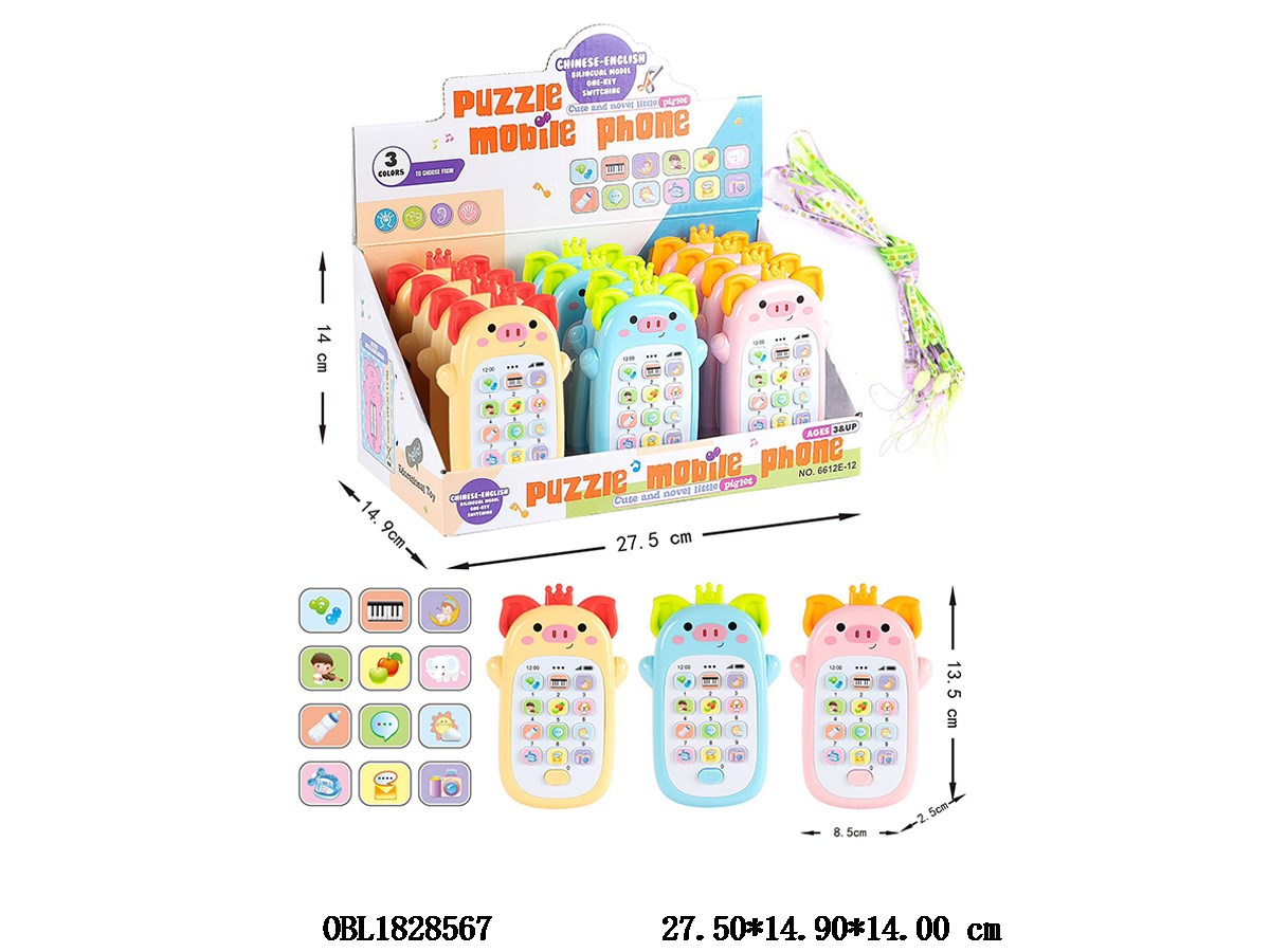 Home > IC Mobile Phone > English puzzle pig mobile phone with music 2 * AAA, no electricity, 3 colors mixed, 12 pieces, 1 display box