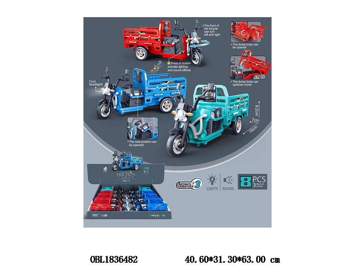 Home > F/P Motorcycle > Inertial motorcycle tricycle with lighting, music, 3 * AG13 package, electric, 3 colors mixed, 8 pieces per display box