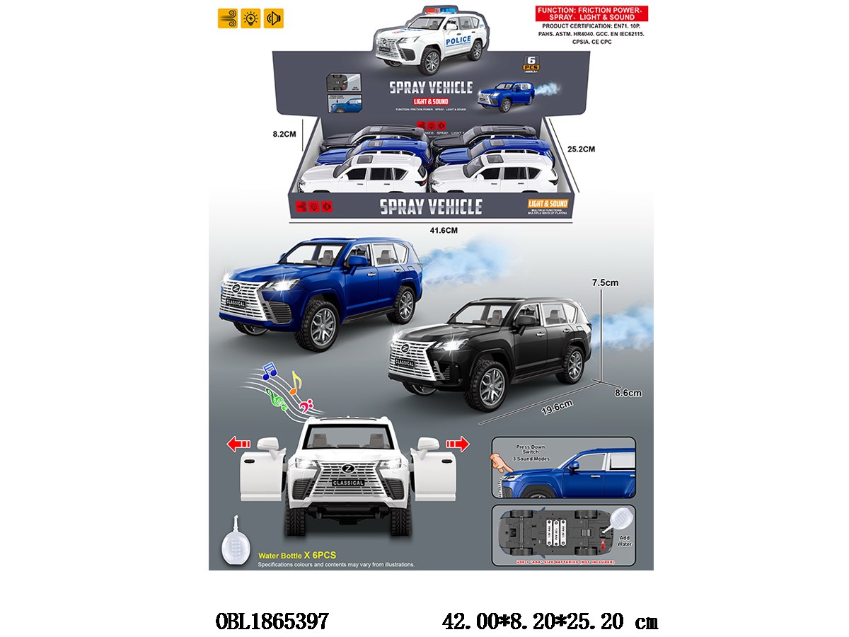 Home > F/P Car > Inertia car with light, music, spray, openable, 3 * AAA, non electric, 3-color mixed package, 6 pieces, one display box