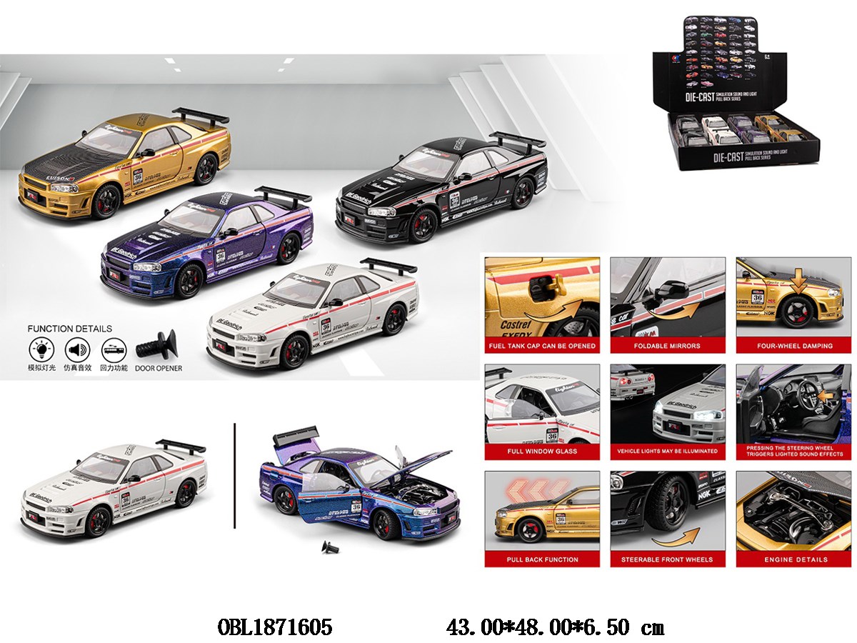 1: 24 alloy regenerative car with light and sound, capable of opening doors, 3 * AG13 electric package, 4 colors mixed, 8 pieces, 1 display box