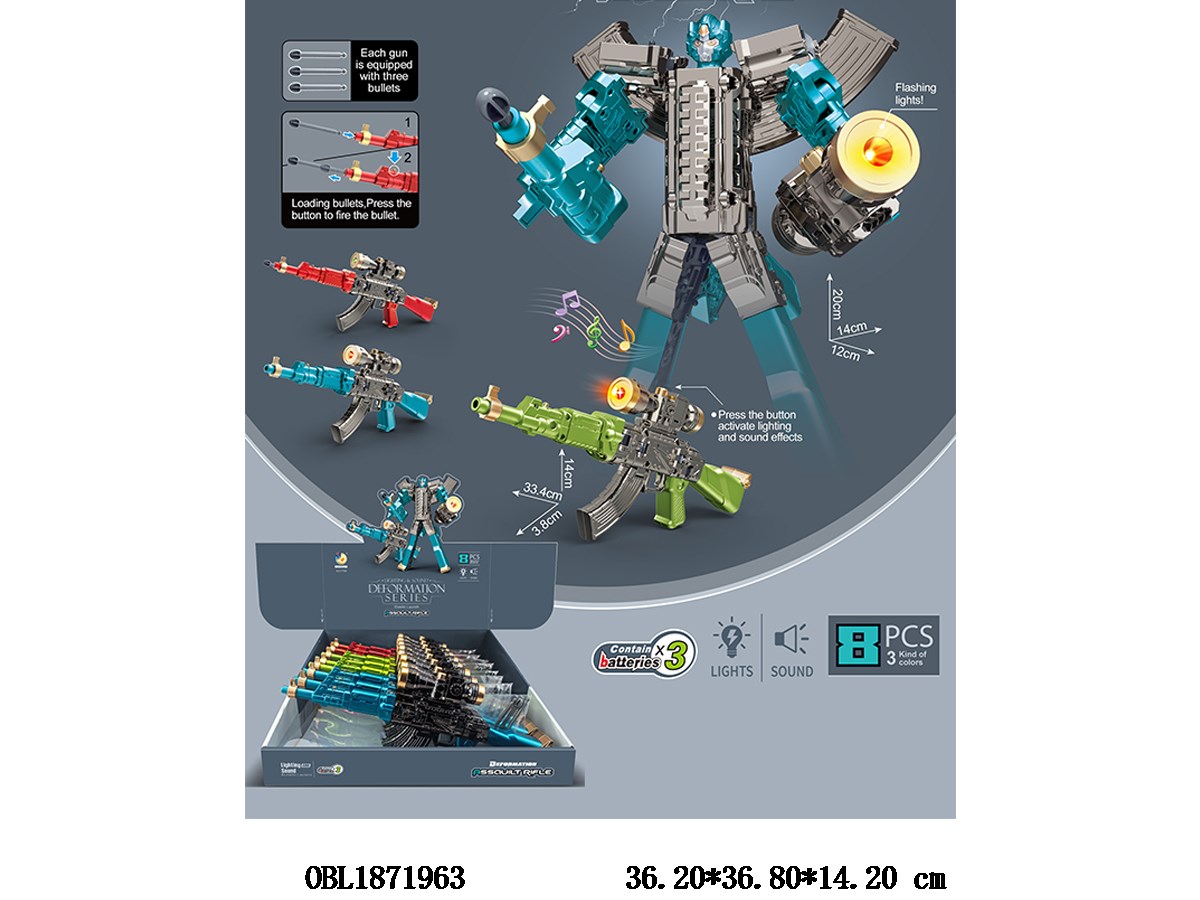 Catapult rifle deformation robot with sound and light, USB cable, 3.7V lithium battery pack, 3-color mixed packaging, 8 pieces per display box