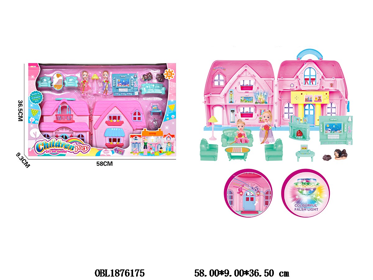 Villa set with 2 3.5-inch solid body Barbie with lights, dog sound doorbell, 2 * AA non electric color lights, 3 * AG13 electric included