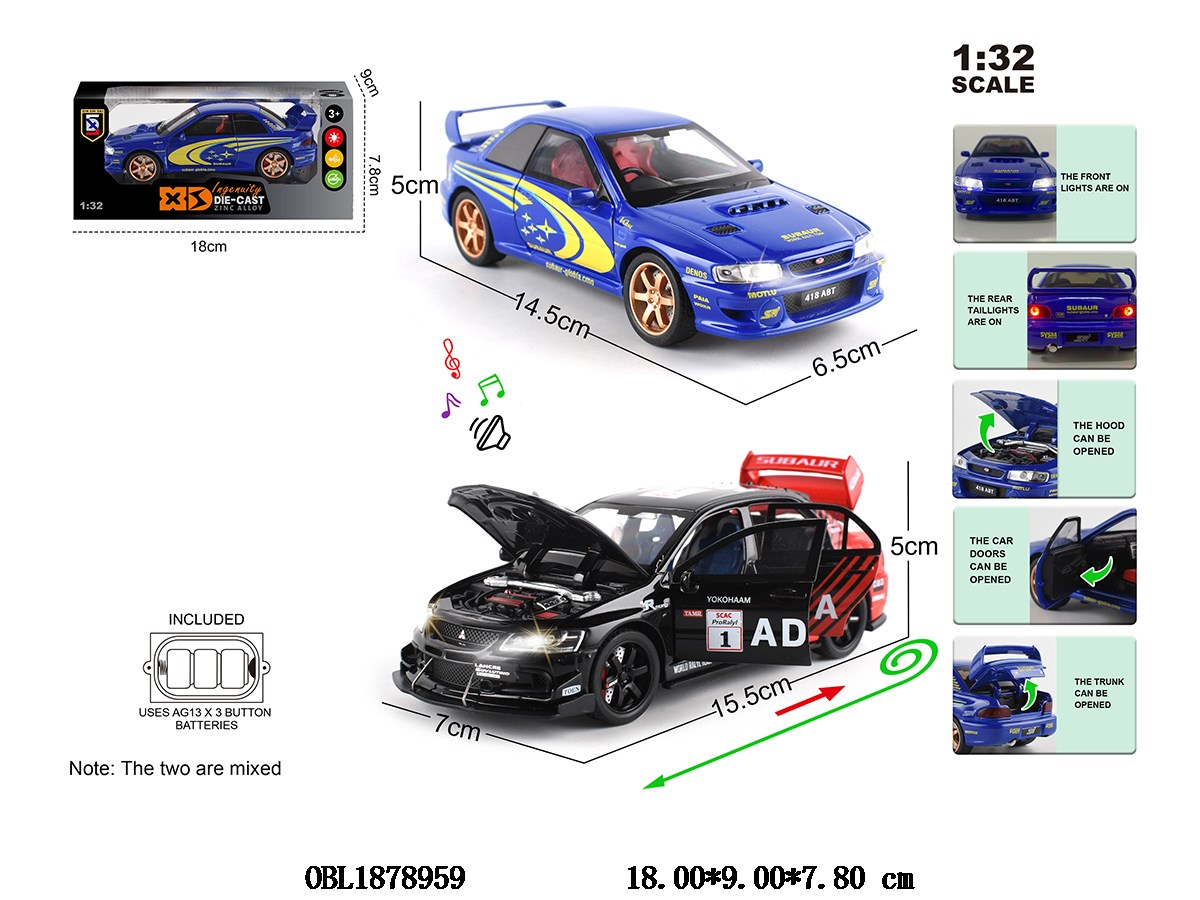 1: 32 zinc alloy regenerative car with light and sound, capable of opening doors, 3 * AG13, electric package, 2 mixed models