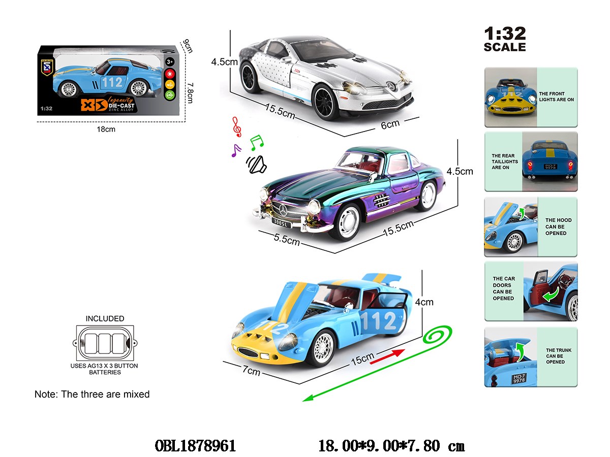 1: 32 zinc alloy regenerative car with light and sound, capable of opening doors, 3 * AG13, electric package, 3 mixed models