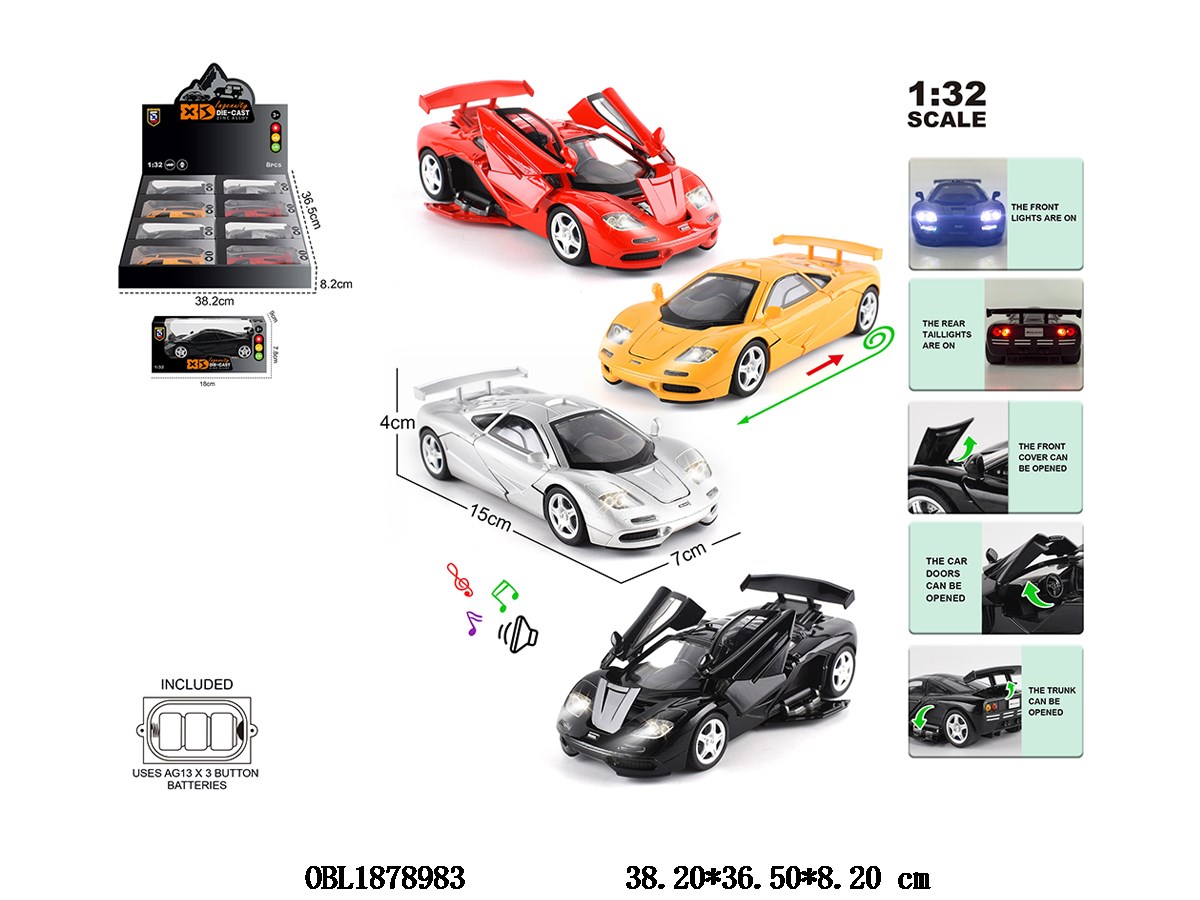 1: 32 zinc alloy regenerative car with light and sound, capable of opening doors, 3 * AG13 electric package, 4 colors mixed, 8 small boxes packaged in one display box