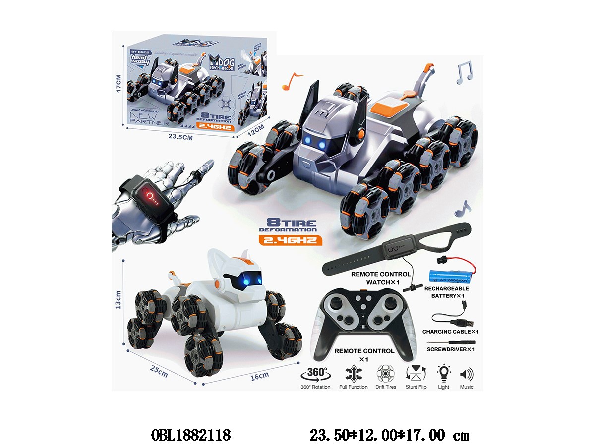 Intelligent remote control electric dog with music and USB cable 3.7V lithium battery included remote control 2 * AAA non included watch remote control 1 * AG13 included power 2.4G frequency 2-color hybrid