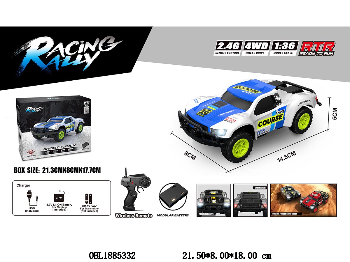 1: 36/2 ratio remote control short truck with lights and USB cable, body 3.7V soft pack battery included remote control 2 * AA without power, 2.4G frequency
