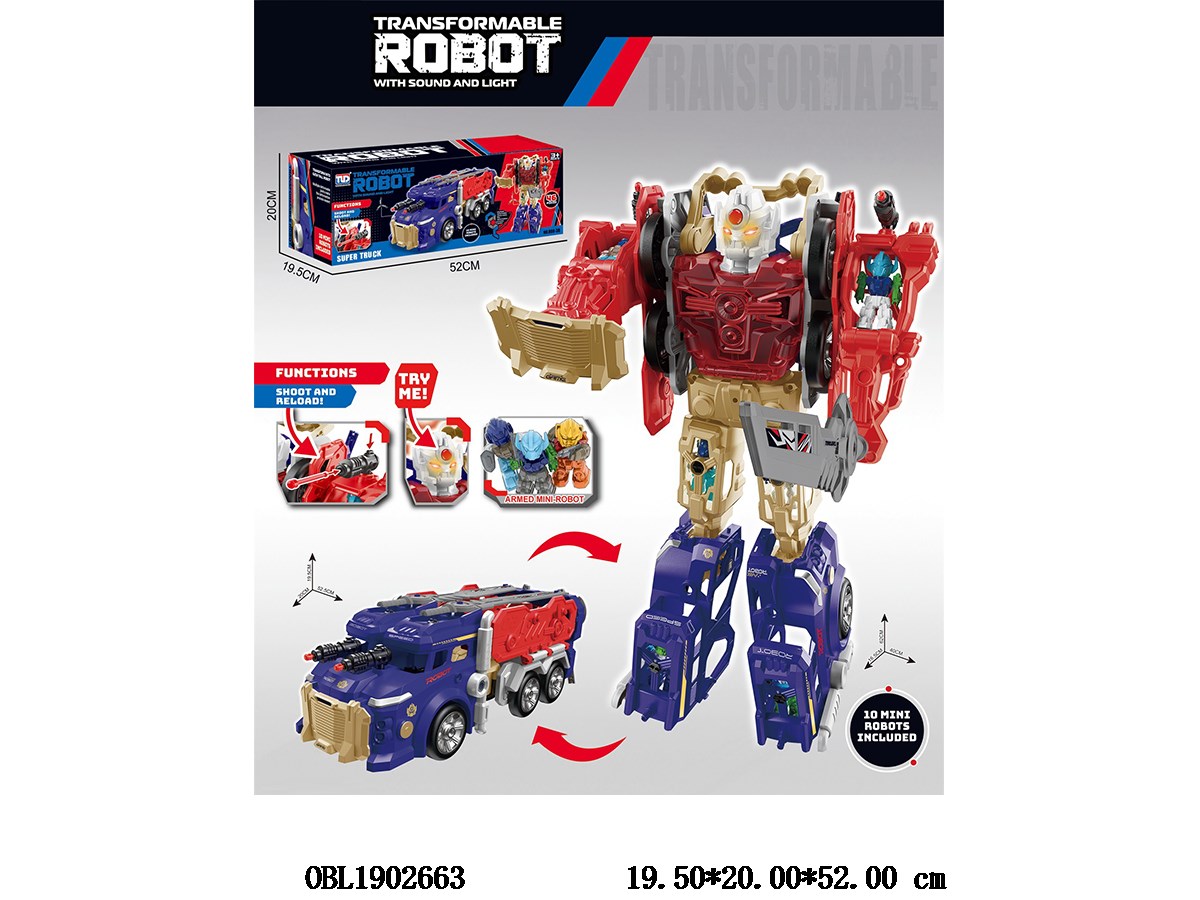 Transformed truck with lights, sound, and 10 small robots 2 * AG13, including electricity