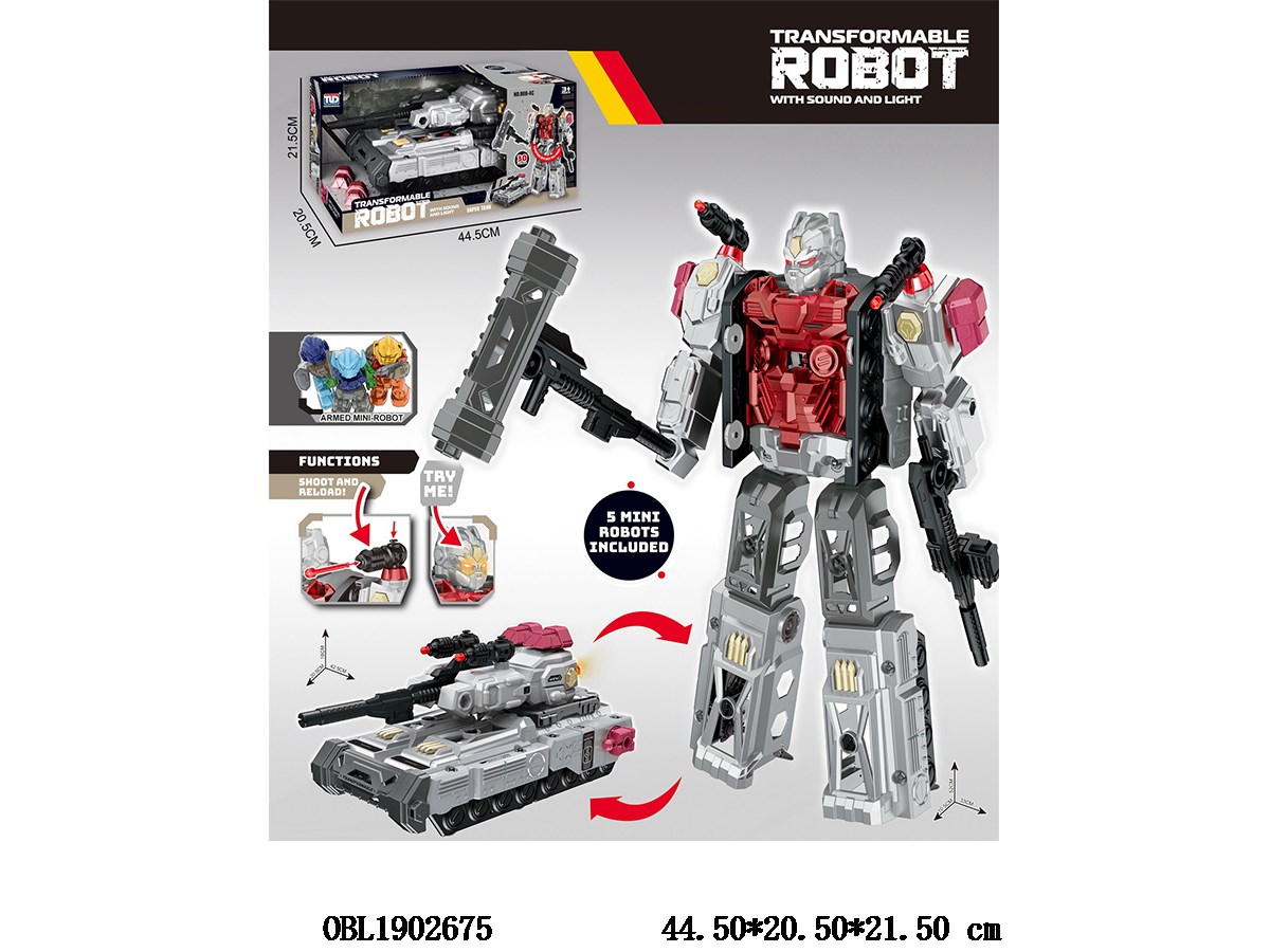 Transforming tank with lights, sound, and 5 small robots, total 6 * AG13, power included