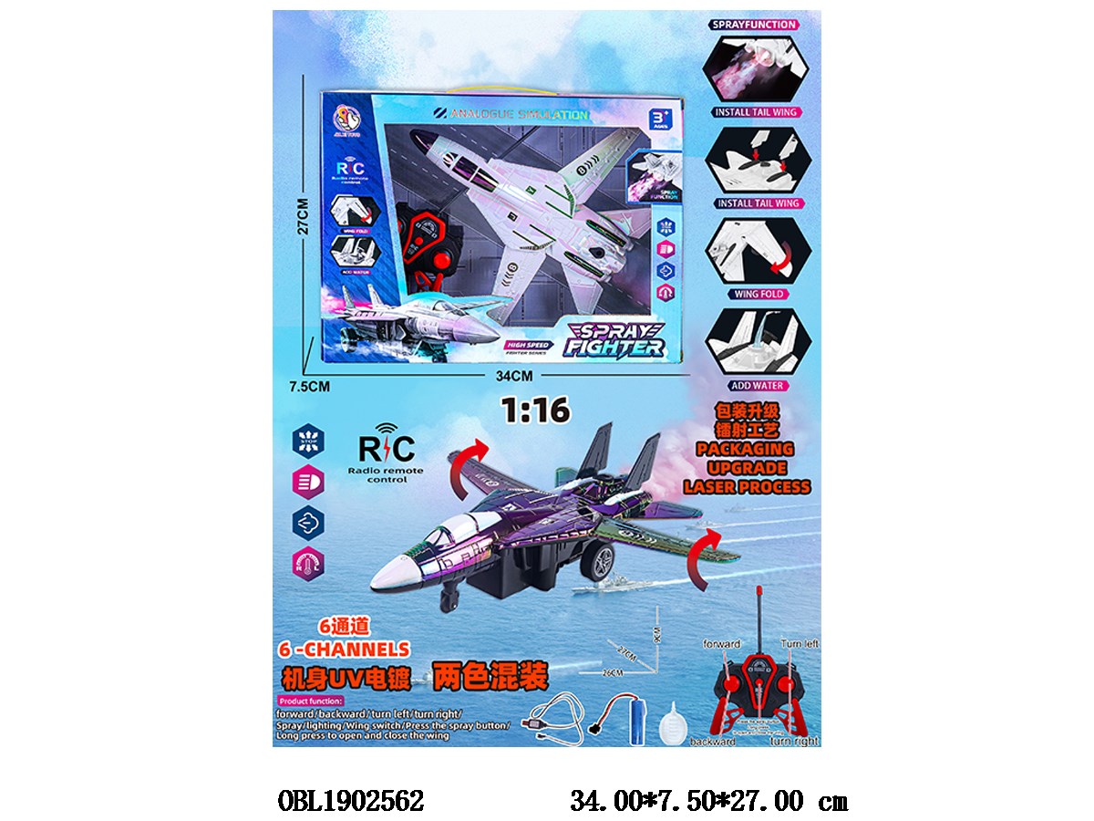 Six way remote control fighter with light spray equipped with USB cable body 3.7V lithium battery pack electric remote control 2 * AA non electric 49 frequency two color mixed