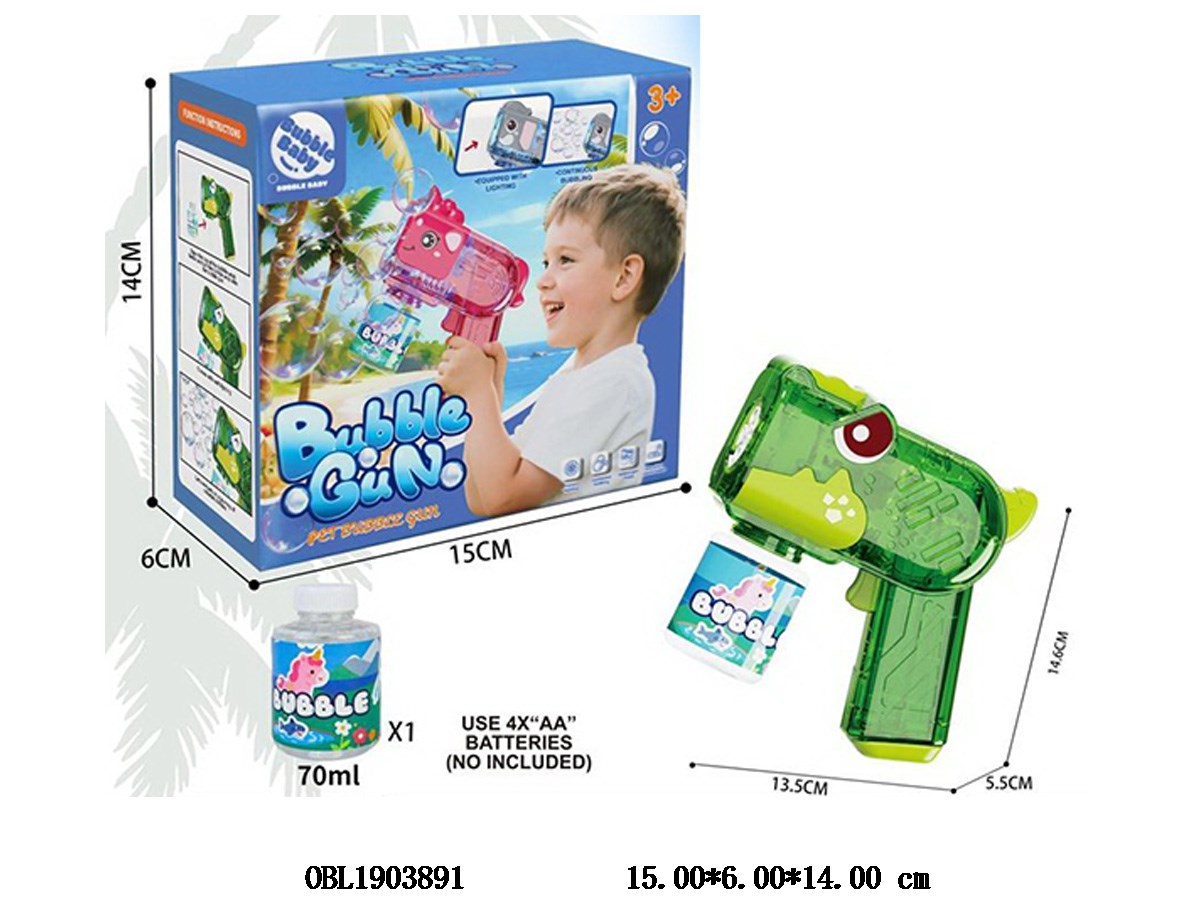 Electric transparent dinosaur bubble gun with 1 bottle of 70ml bubble water 4 * AA, no electricity included