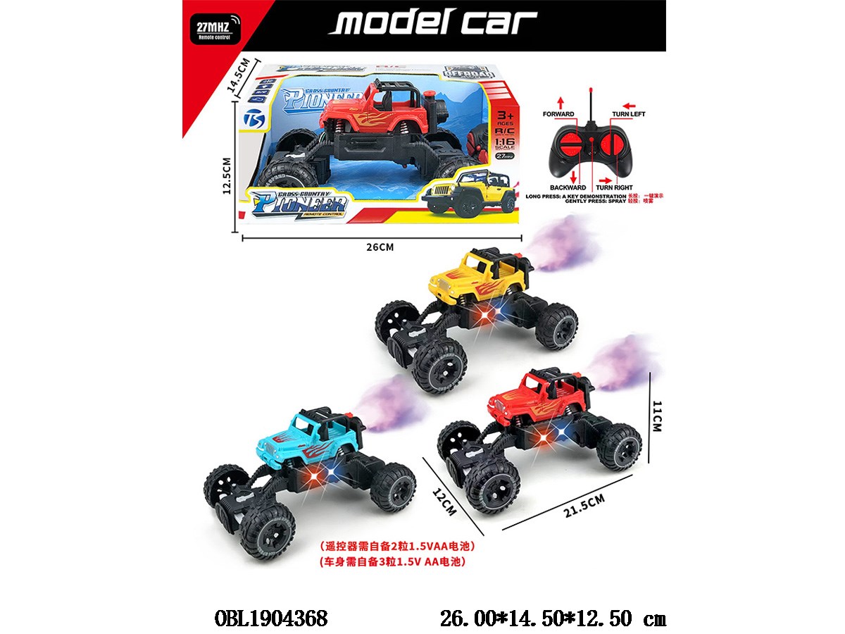 Home > R/C Car > Six way remote control vehicle with light spray one button demo body 3 * AA without electric remote control 2 * AA without electric remote control 27 frequency three color mixed